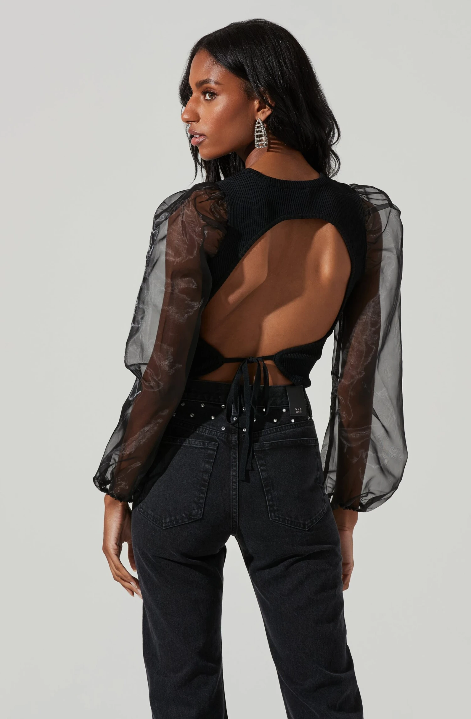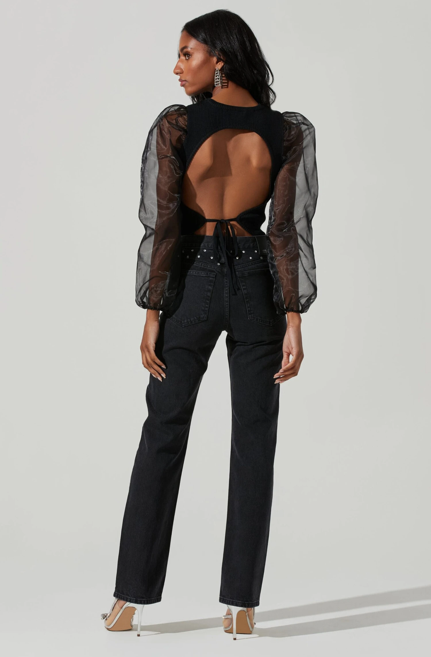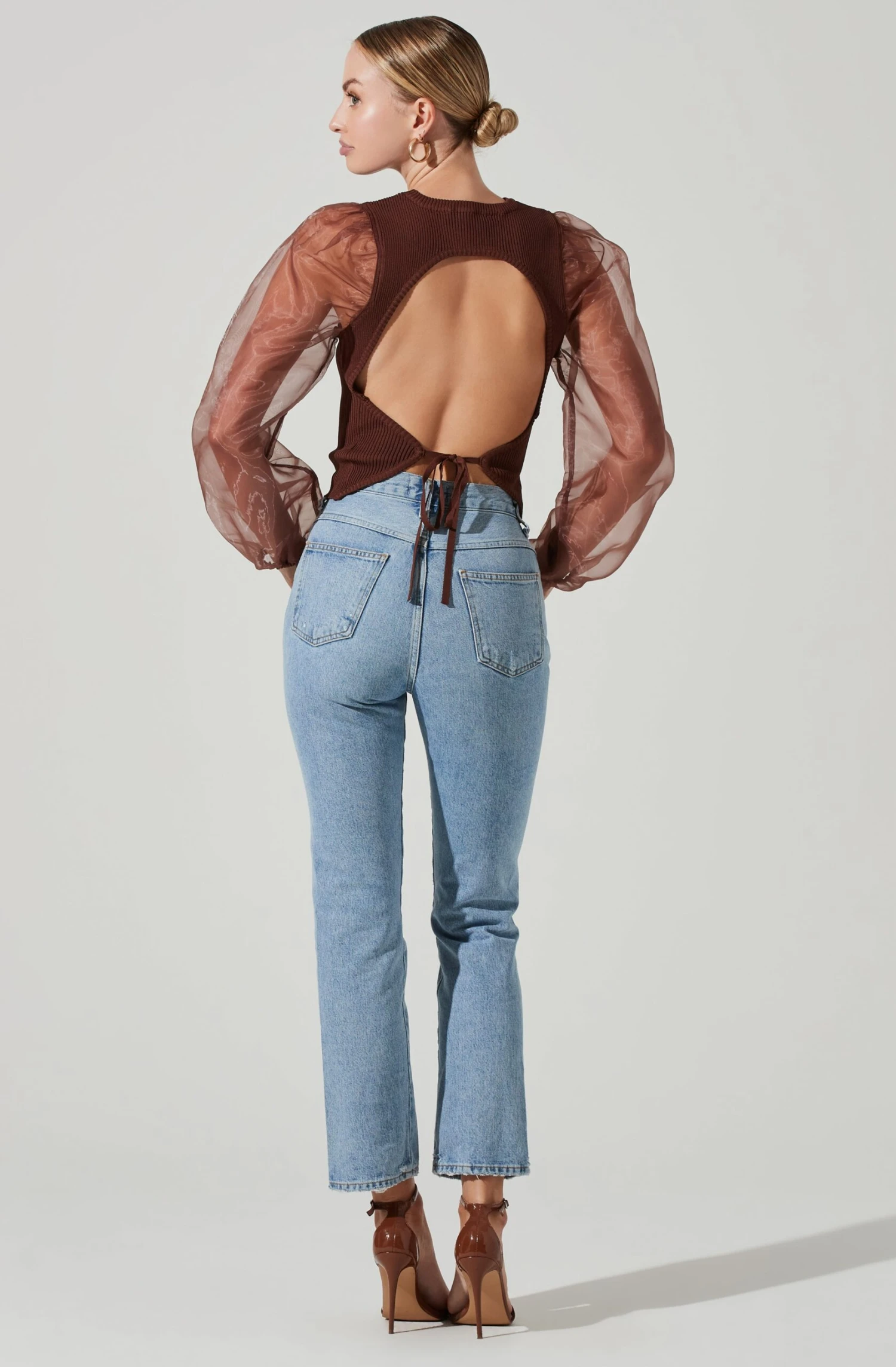 This knit sweater features a round neckline. Open back features a tying strap closure at the back. Chiffon sleeves.