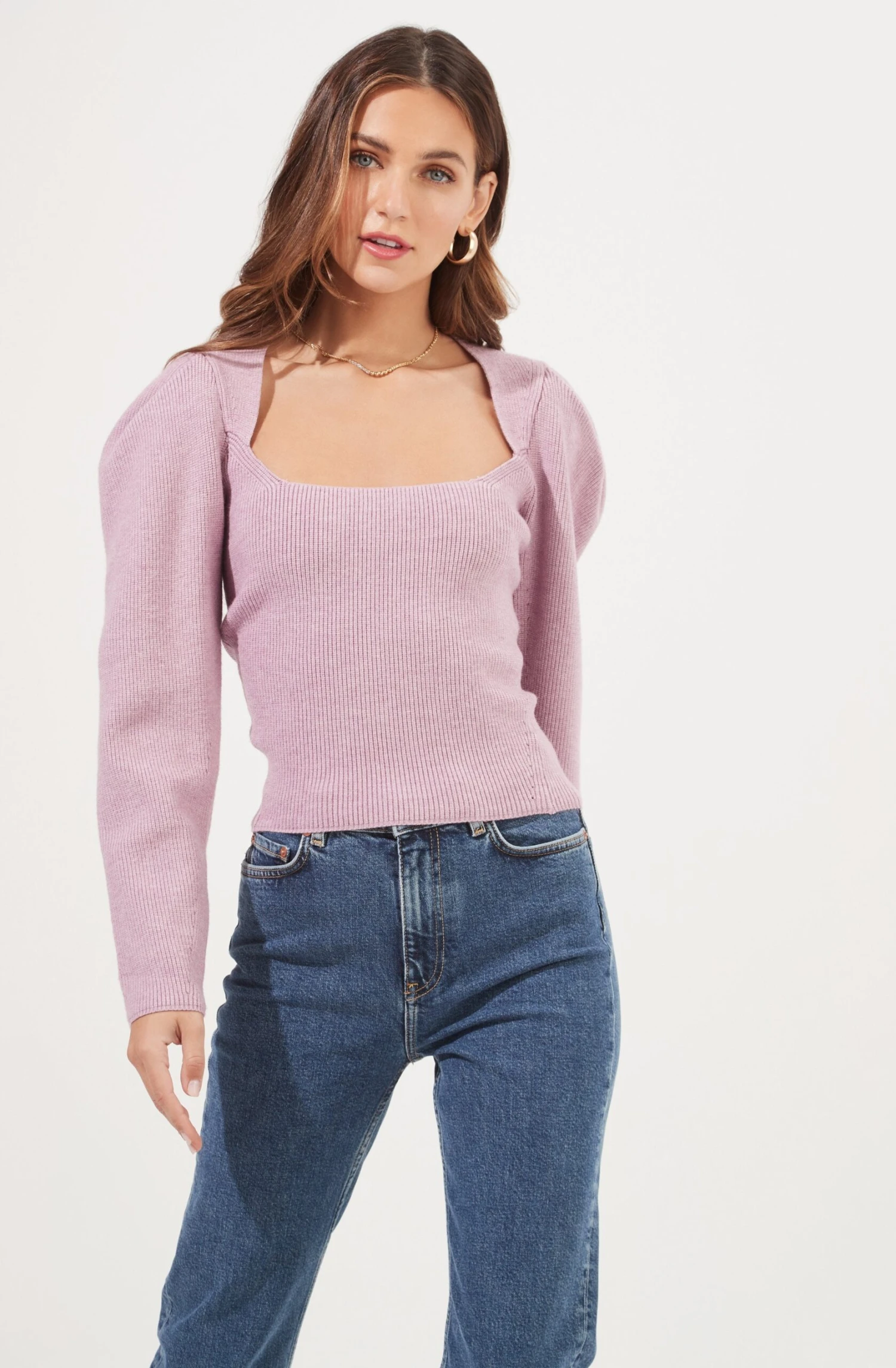The Catalina Sweater features a ribbed knit construction with a square neckline and fitted bodice. Statement cutout back. Voluminous puff sleeves.