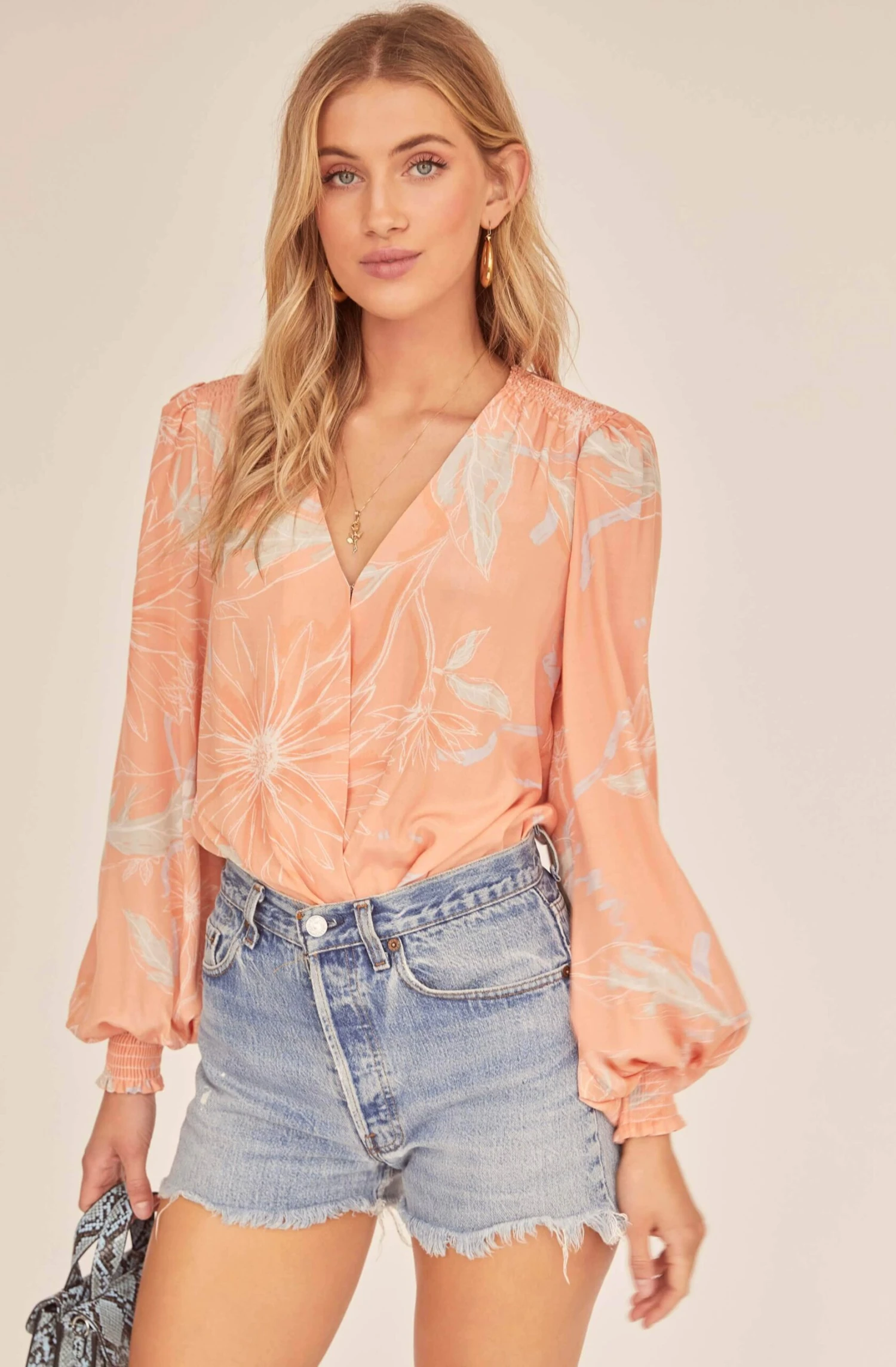 Dixie style comes with femme flair! This bodysuit features a surplice front and plunge neckline. Long puff sleeves and large floral print throughout.