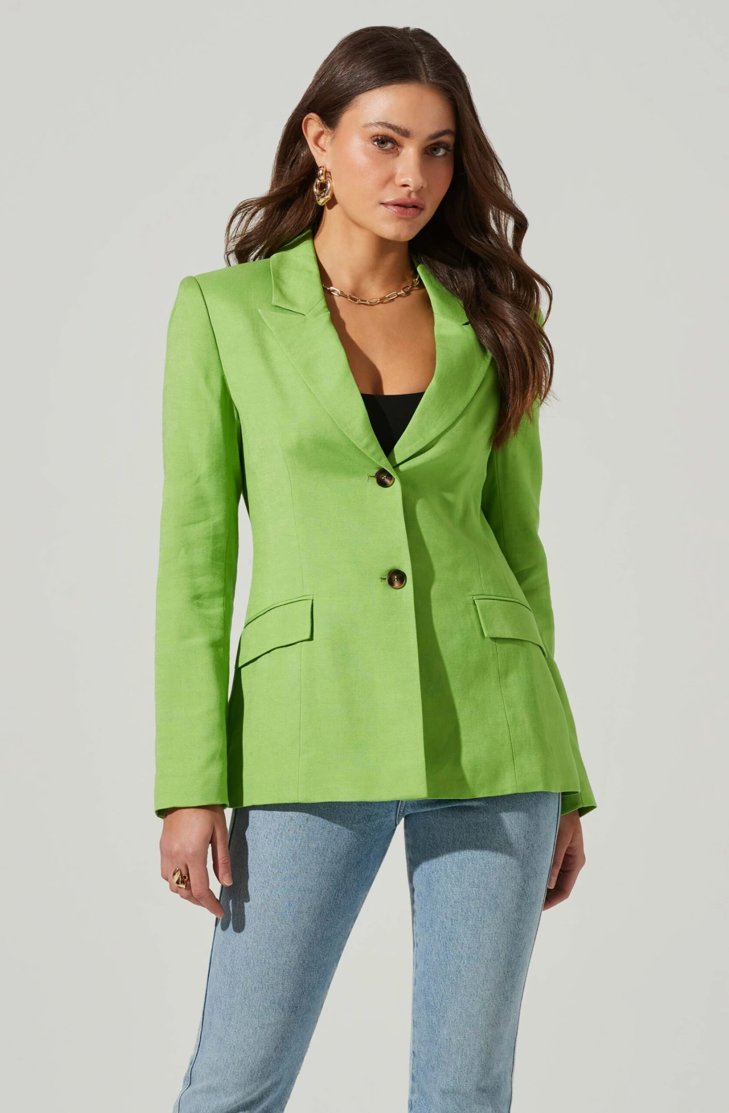 This statement blazer features a fitted silhouette. Notched lapel leads to a buttoned front. Padded shoulders. Long sleeves. Flap pockets.