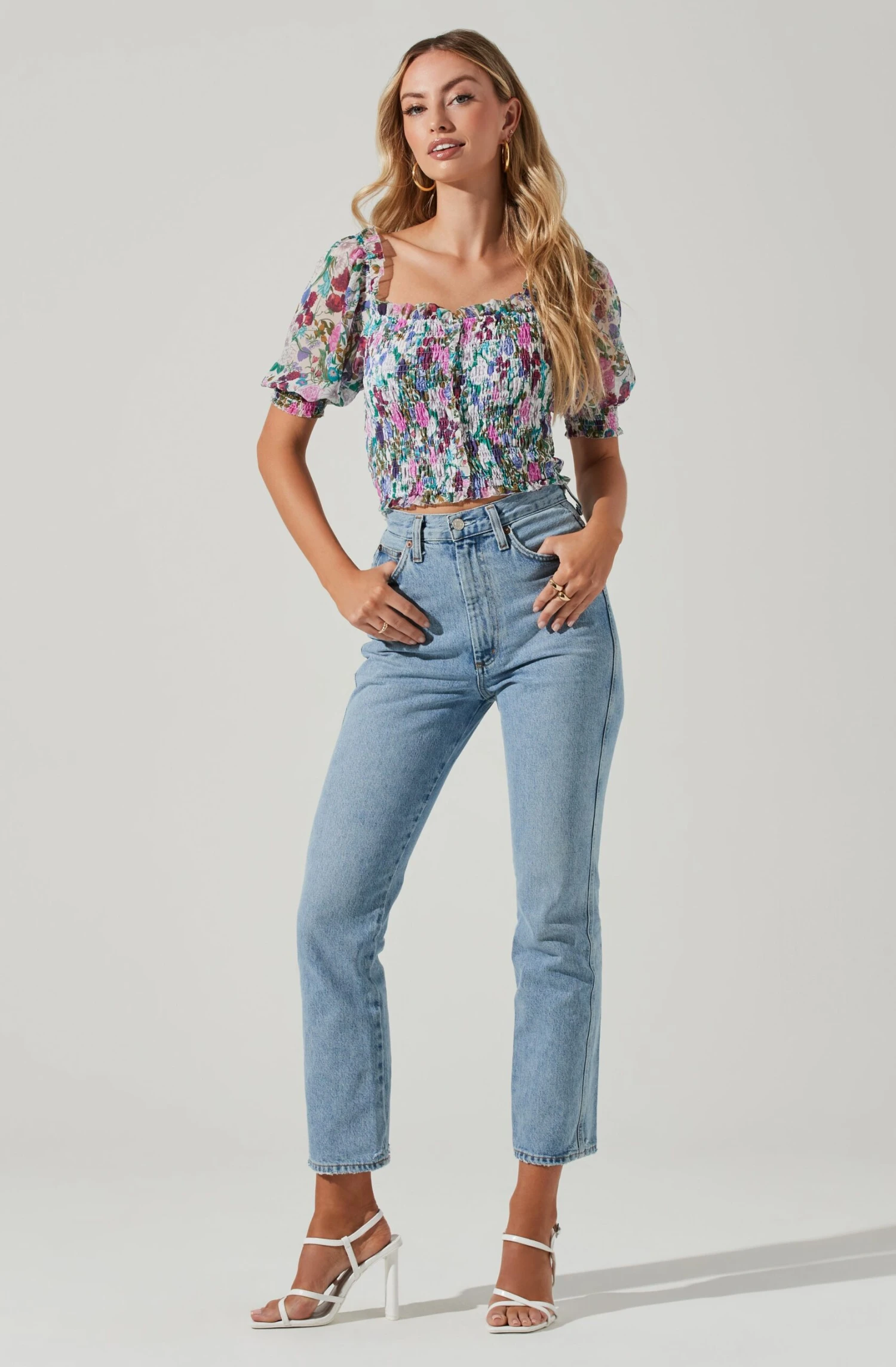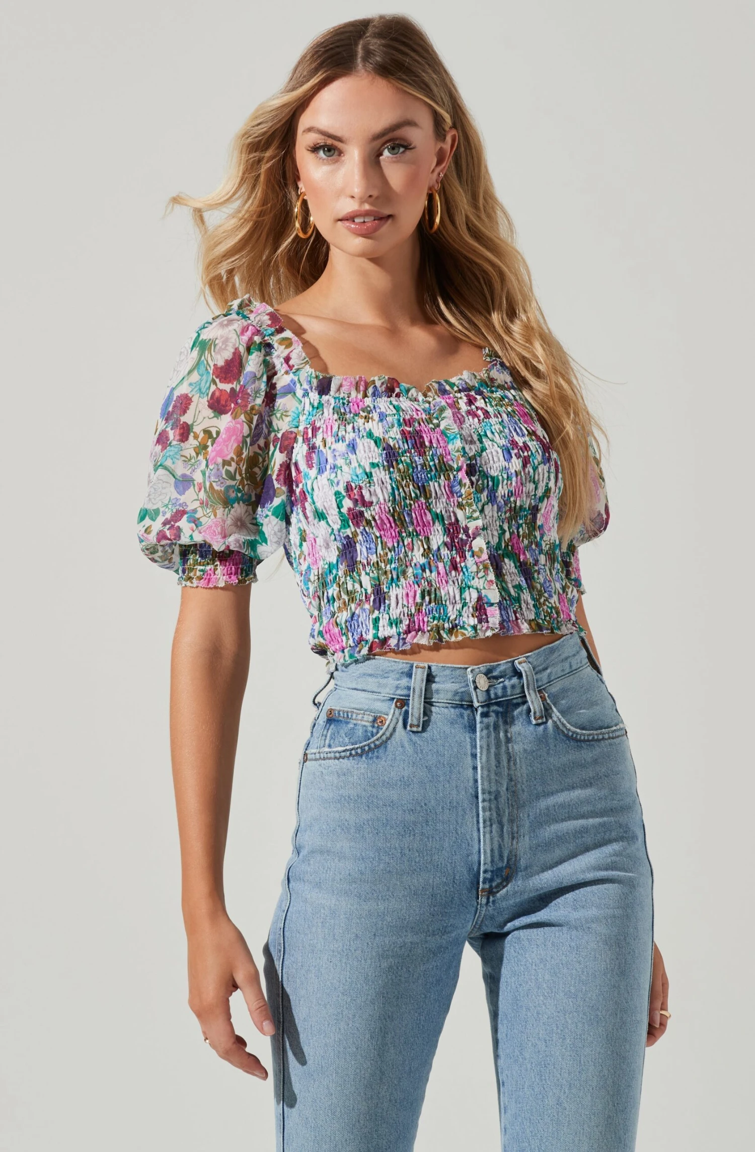This statement top features a bright floral print throughout. Square neckline leads to a smocked front and puff half sleeves. Smocked cuffs.