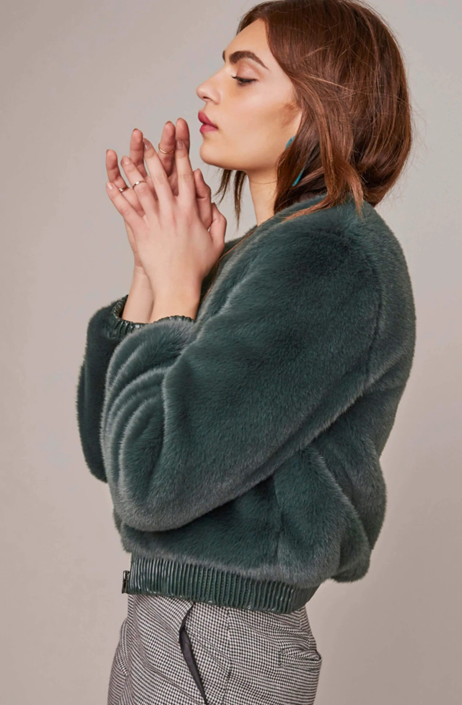 Brave the cool days ahead in faux fur. This luxe jacket features a ribbed collar and cuffs along with slanted hip pocket accents. Long sleeves.