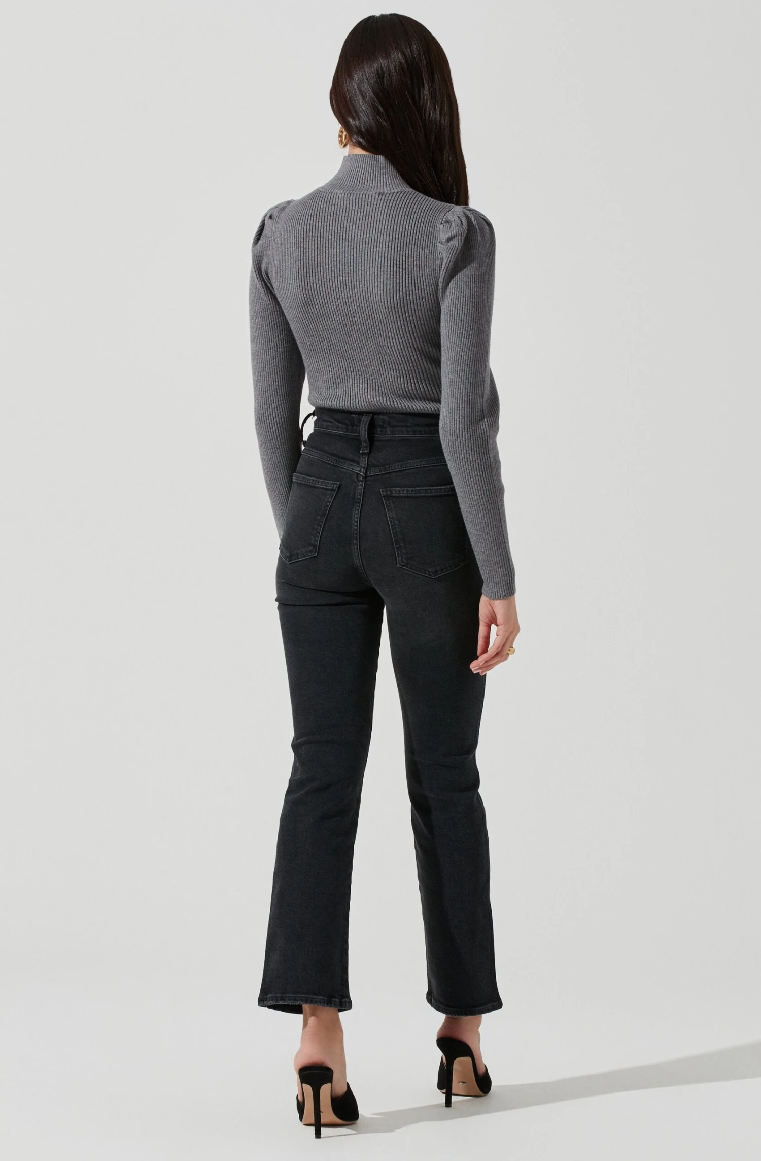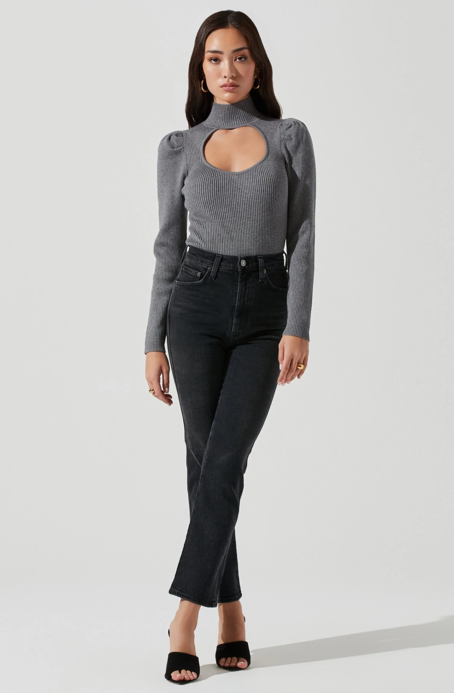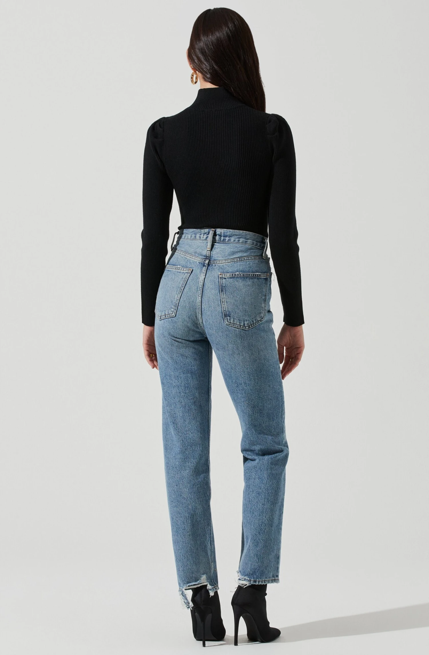 This chic bodysuit features a mock neck design with a front cutout accent. Long sleeves. Volume shoulders. Ribbed knit design. Attached thong bottoms have snap button closures.