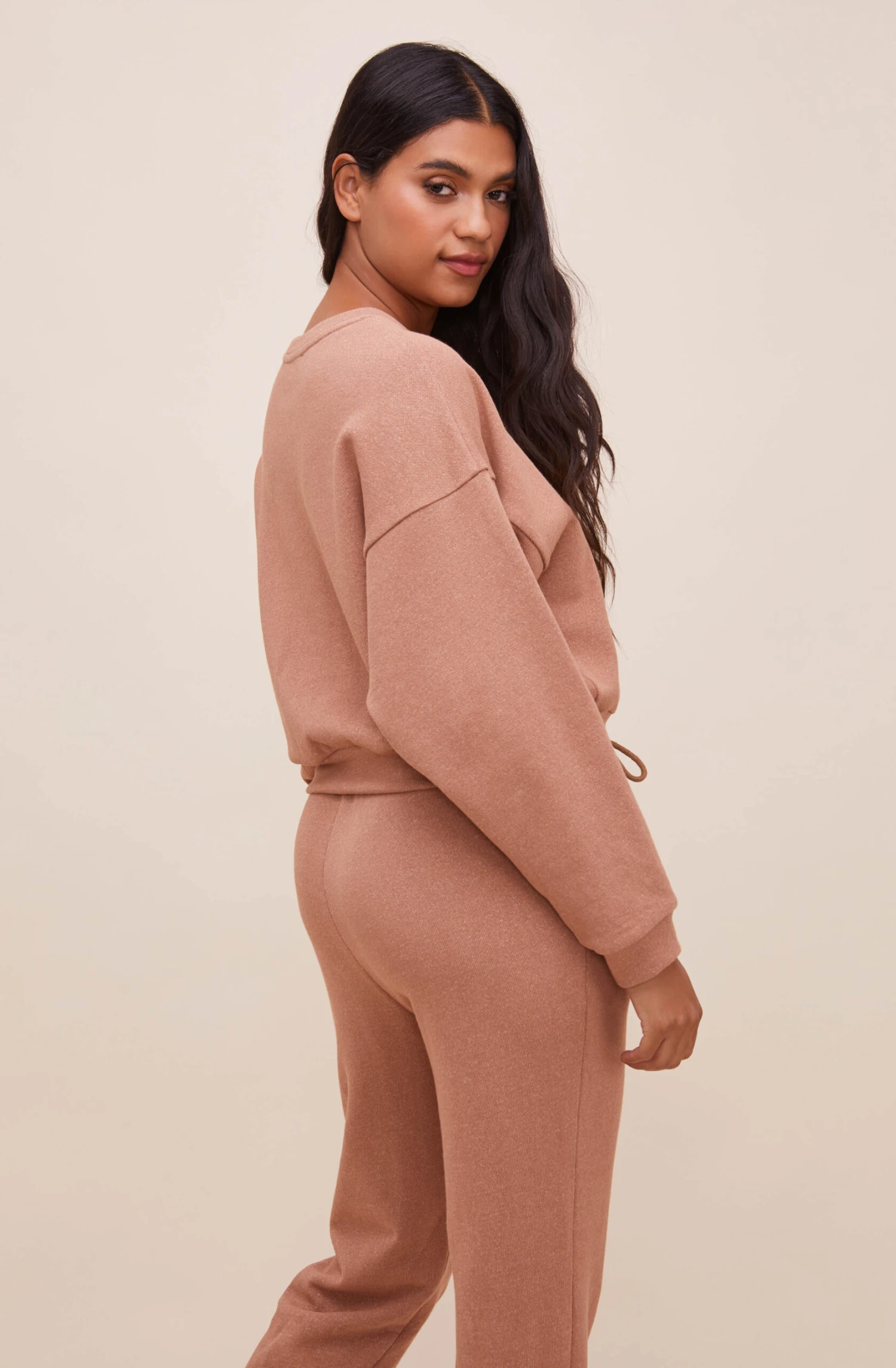 You can still look chic while lounging around. The Haven sweatshirt features a classic crew neckline that descends to long sleeves with dropped shoulders and a flatterint drawstring waist.