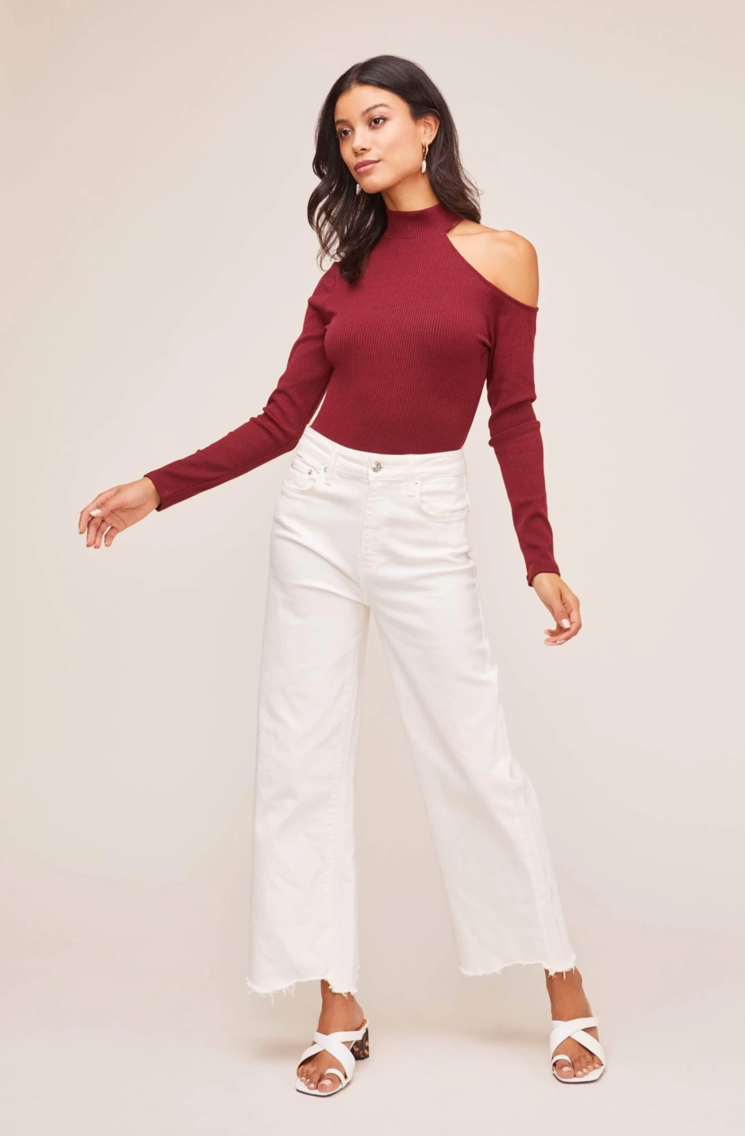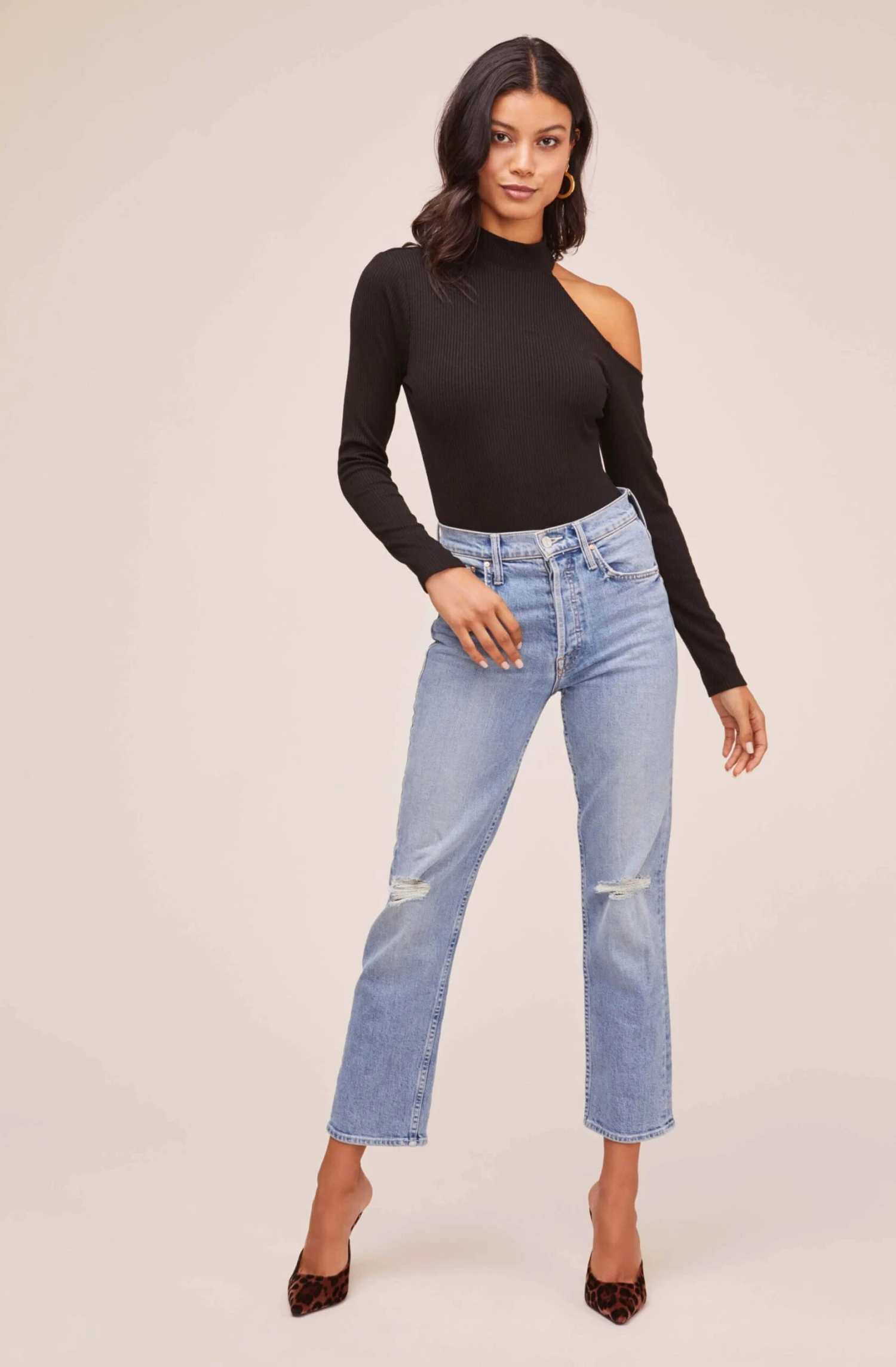Interesting and out-of-ordinary fits like the Cut Out Shoulder Long Sleeve Bodysuit, give your outfit a boost. Mock neck collar leads to a single exposed cutout shoulder and long sleeves.