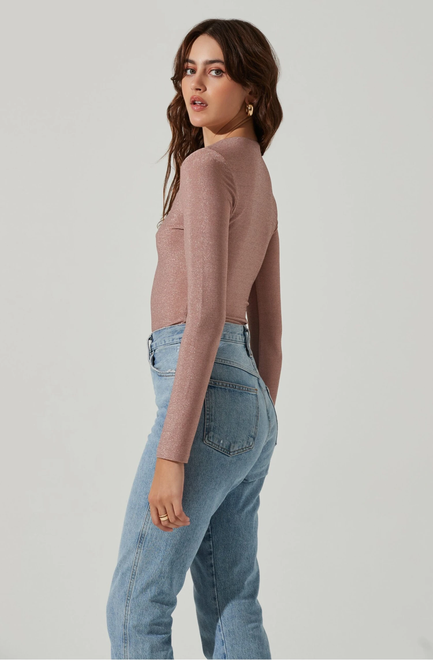 This statement bodysuit features a metallic knit finish. Plunge neckline features a lace up closure. Long sleeves. Attached thong bottoms have snap button closures.
