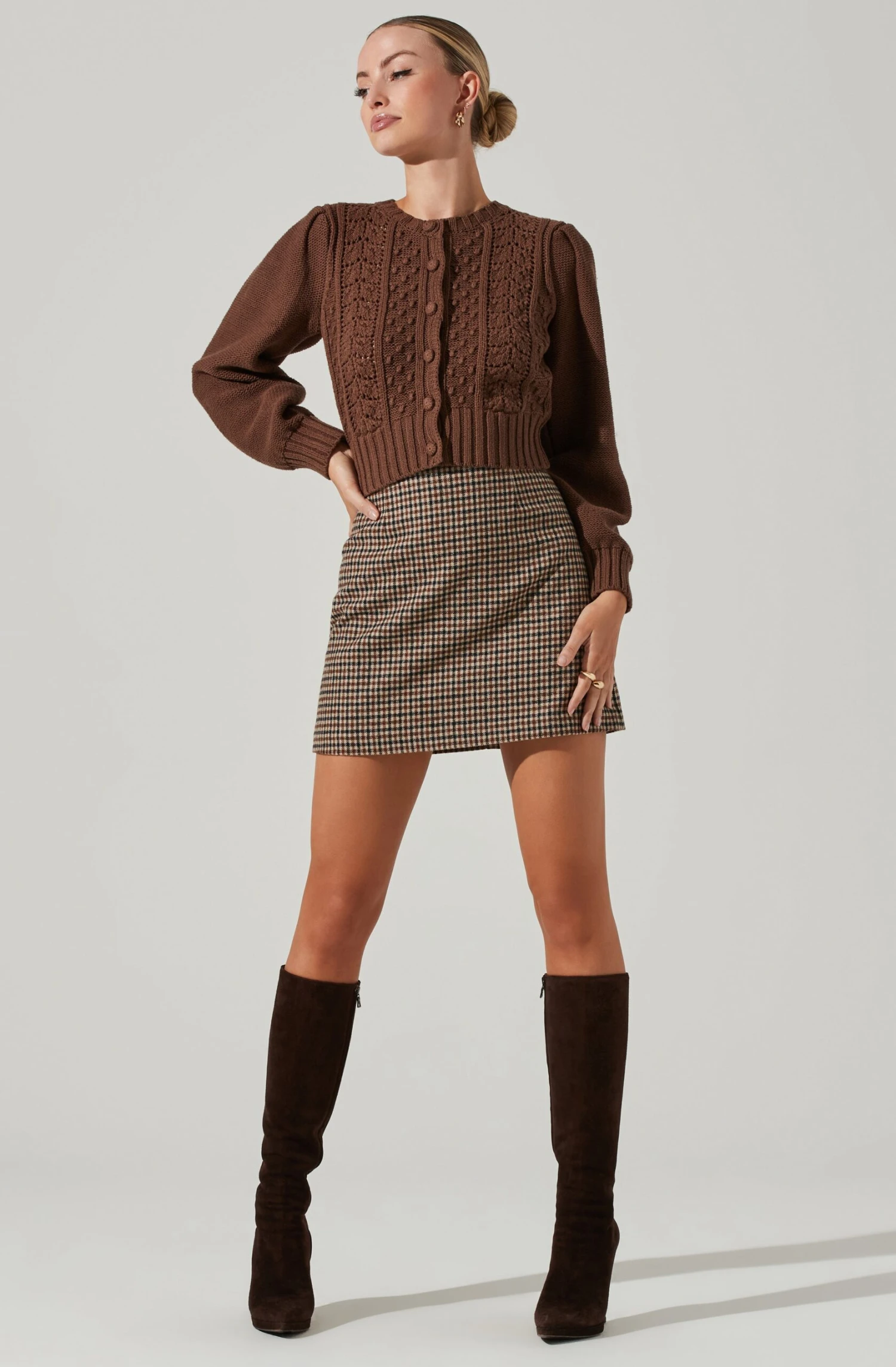 This open-weave cardigan features a front button placket and textured, cable-knit design along the front. Voluminous shoulders and long sleeves. Unlined. Cropped hem.