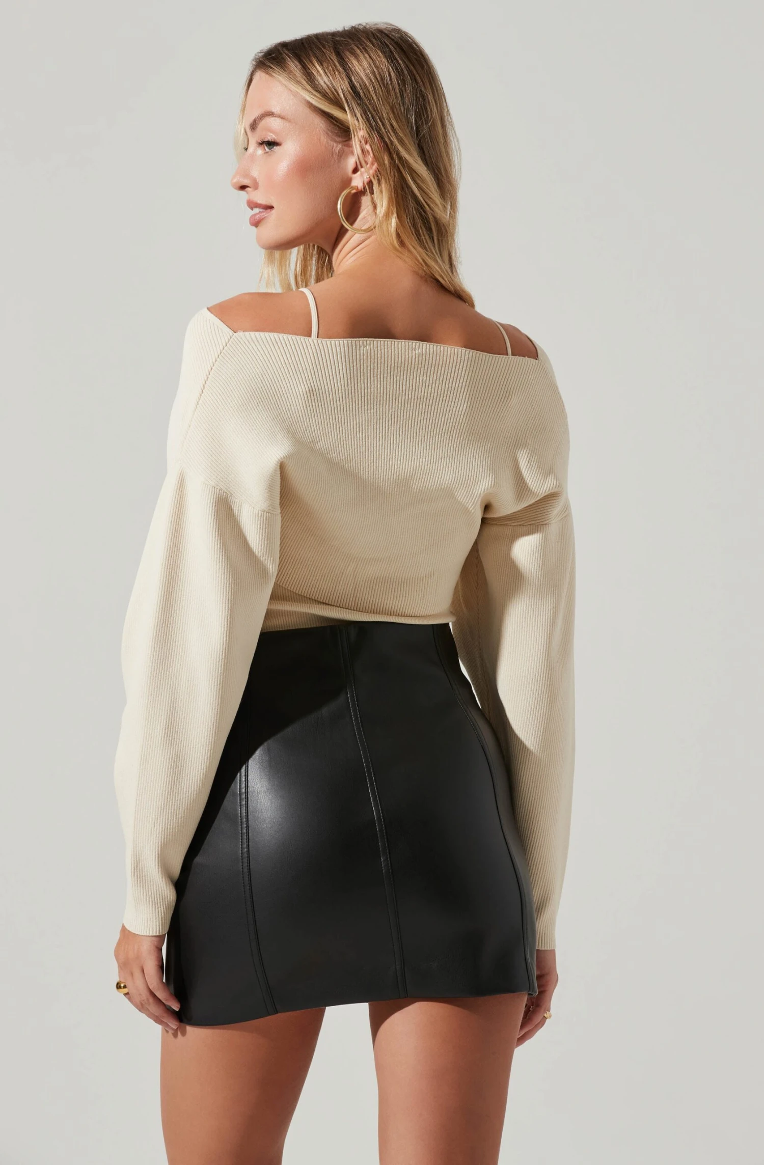 This sweater set features a chic, ribbed knit construction. Cami has a V neckline that leads to defined cups. Accompanying shrug features an off-shoulder neckline that leads to a twist front detail and long sleeves.