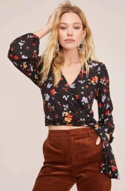 Bright florals stand out against a dark background as fashions most groundbreaking print is reinvented. This chic blouse starts with a V neckline and descends to a wrapped front with a tie waist accent. Long sleeves keep you warm all autumn long.