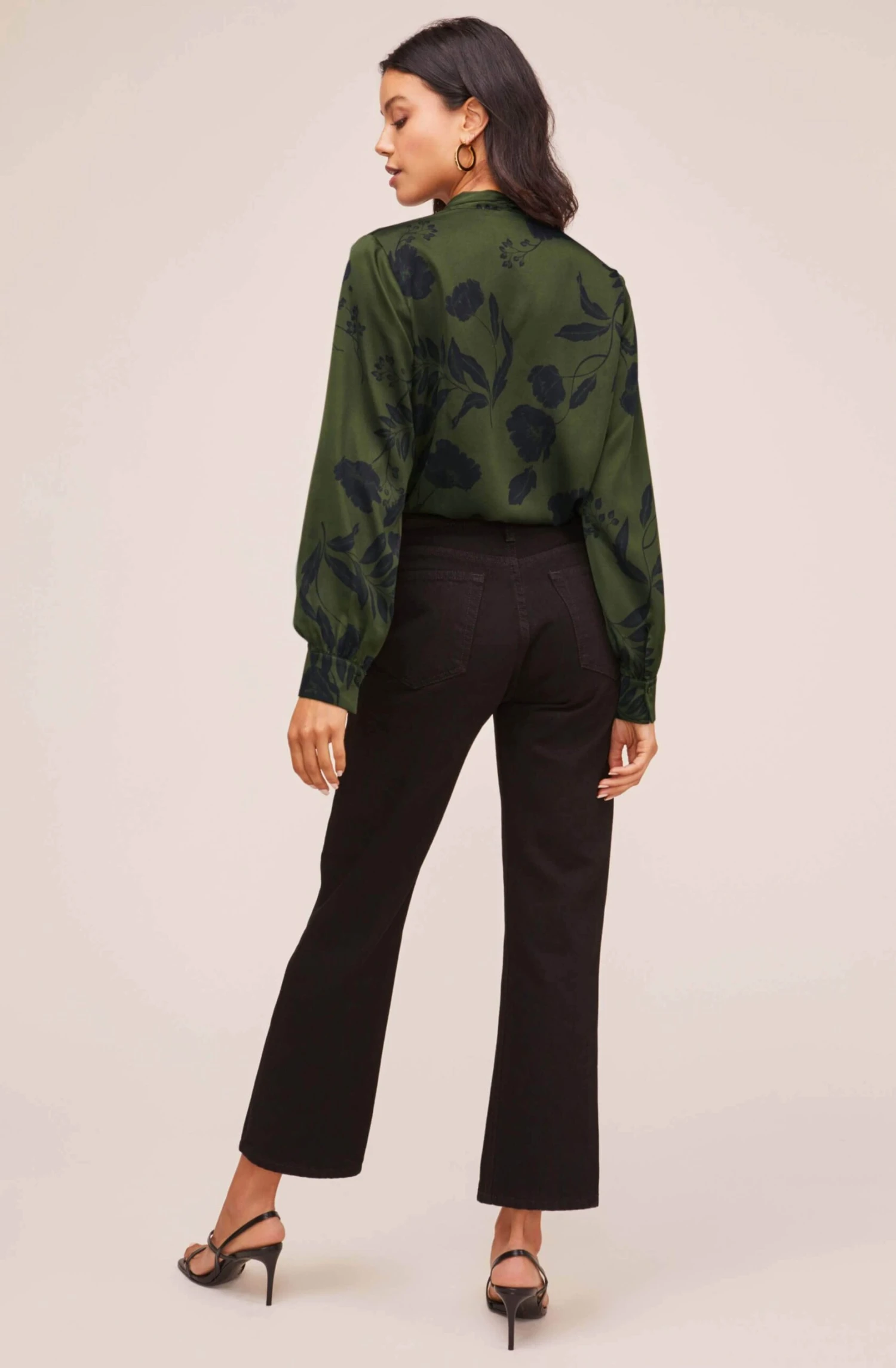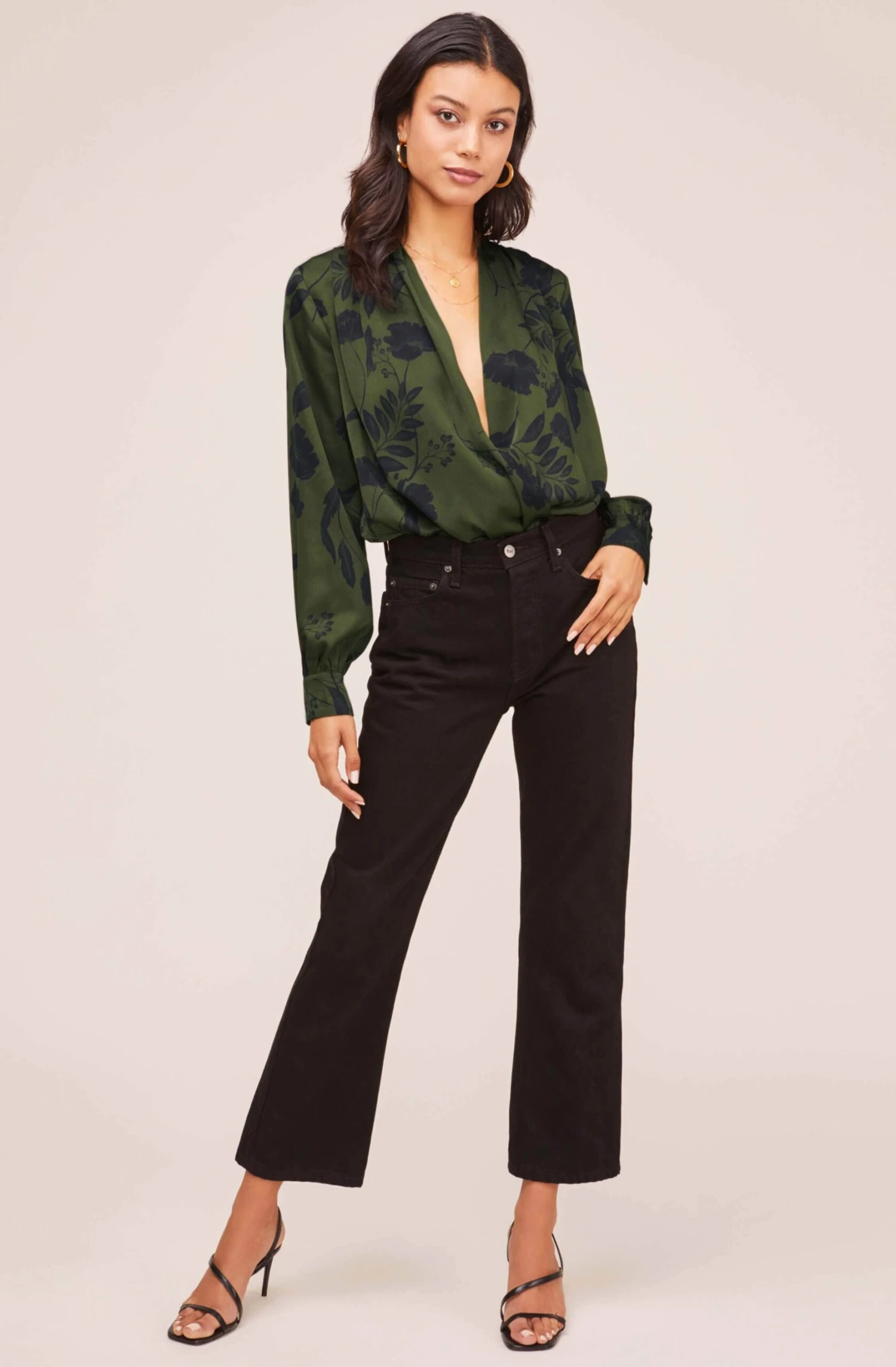 We’ve got the classics with a modern twist! This tried-and-true bodysuit features dark floral print throughout, an exaggerated plunge neckline and long bishop sleeves. Relaxed bodice.