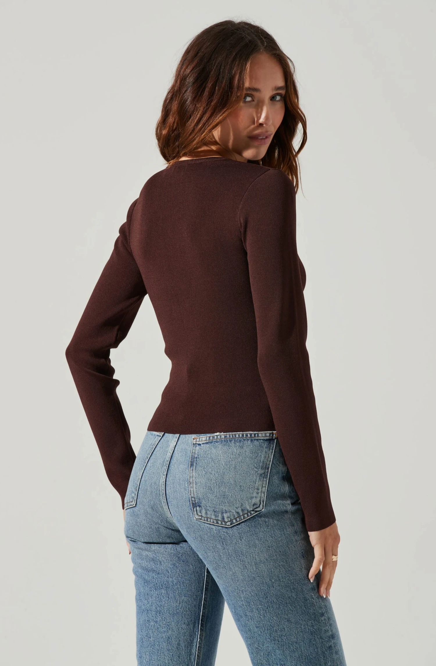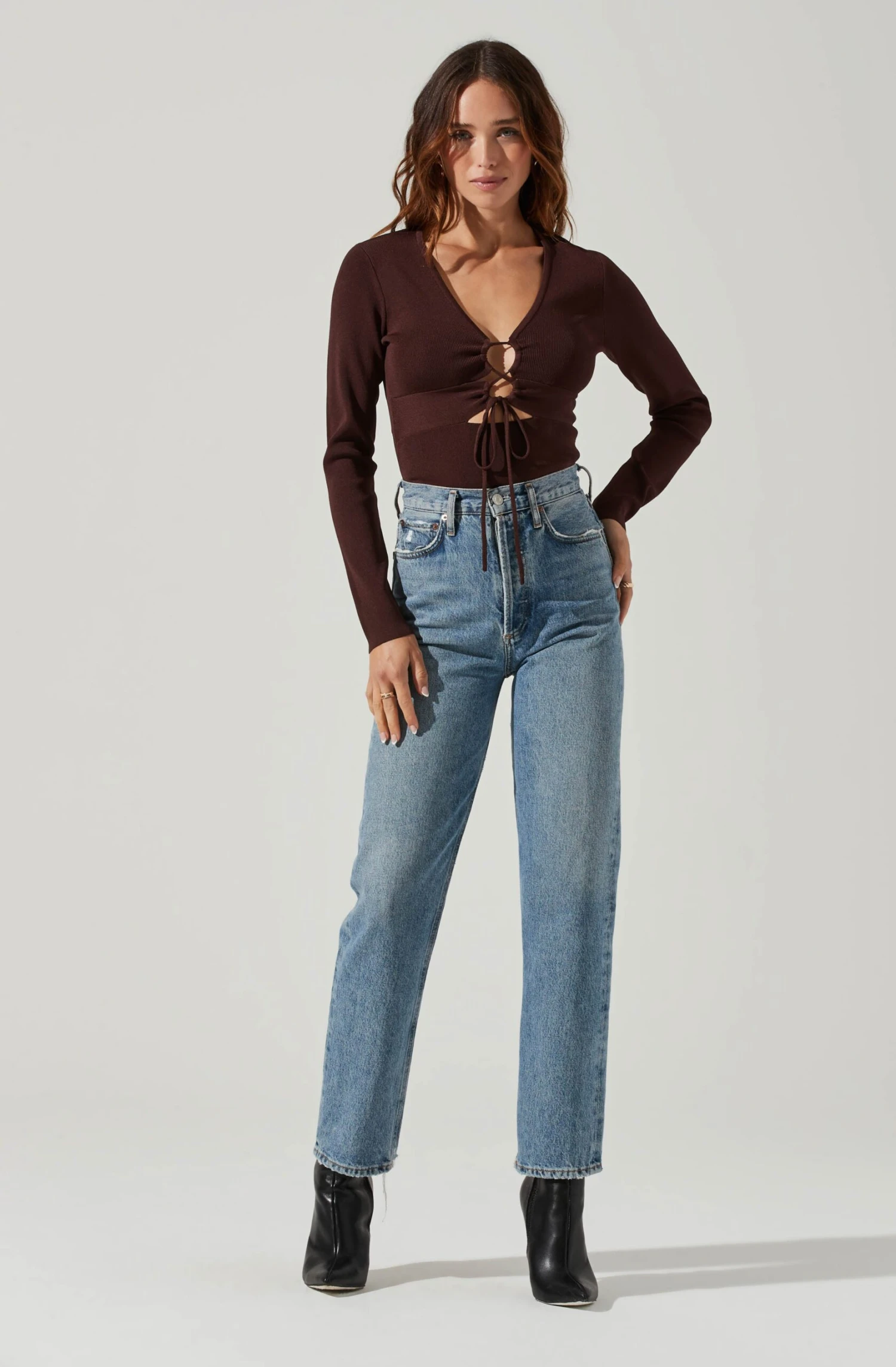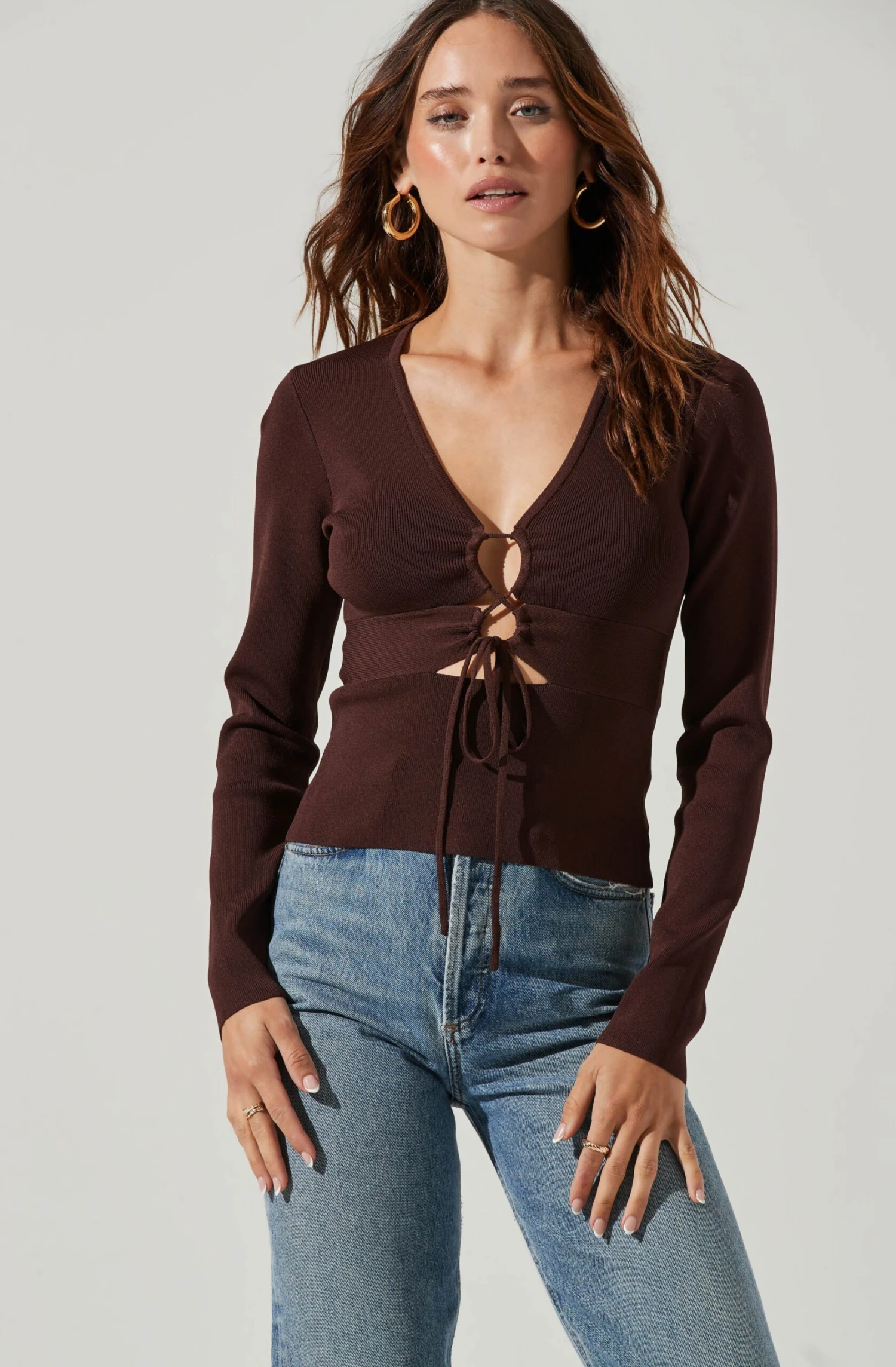 The Nella Top features a plunge neckline that leads to a cutout bust with tying drawstring accents. Long sleeves. Slight stretch.