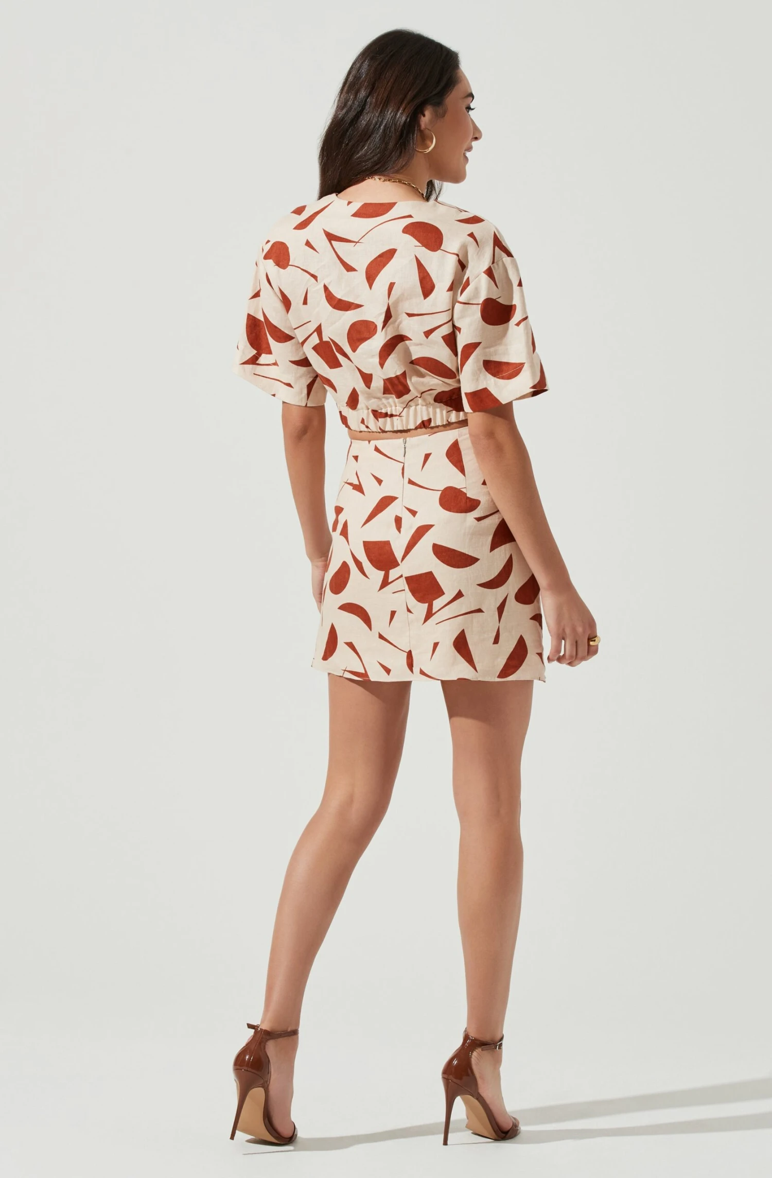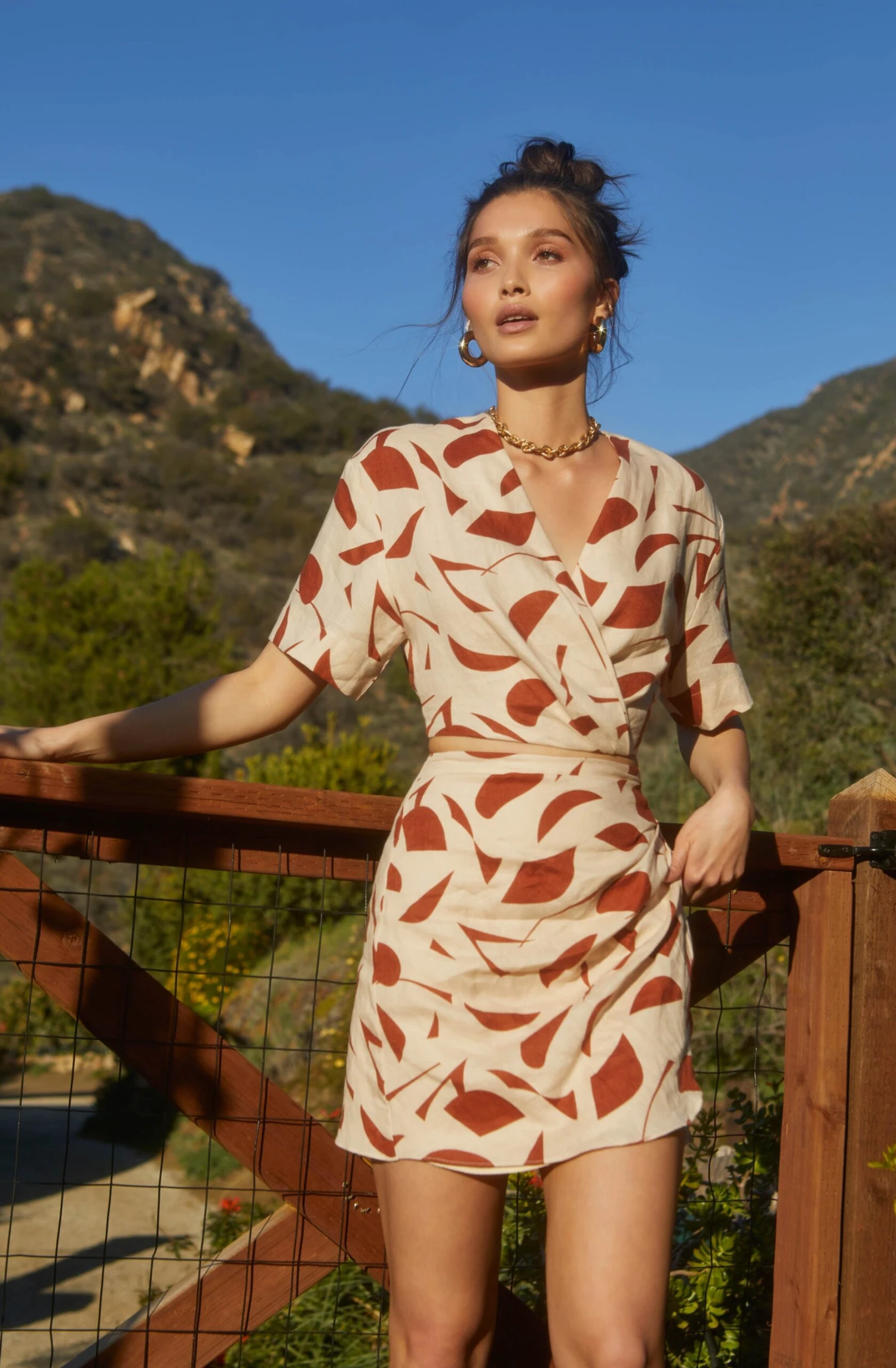The Nirina Top features a flattering abstract print. V neckline leads to a wrapped front and elastic waist. Short sleeves.