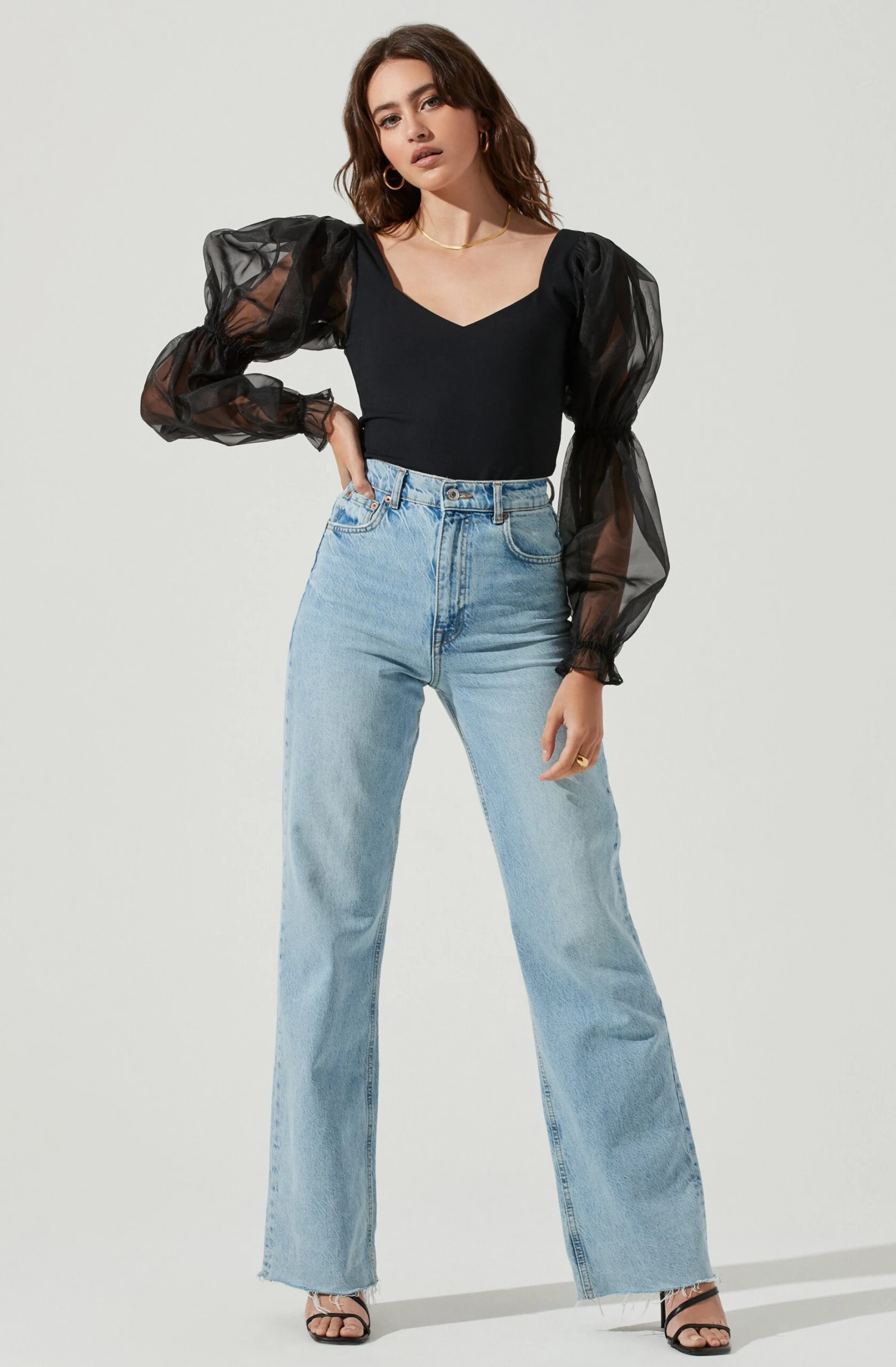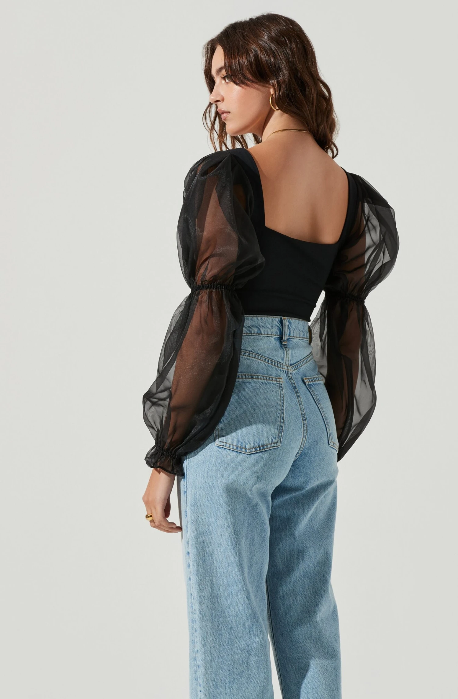 This statement bodysuit features a flattering sweetheart neckline that leads to a solid bodice with attached bottoms and snap button closures. Long organza puff sleeves.