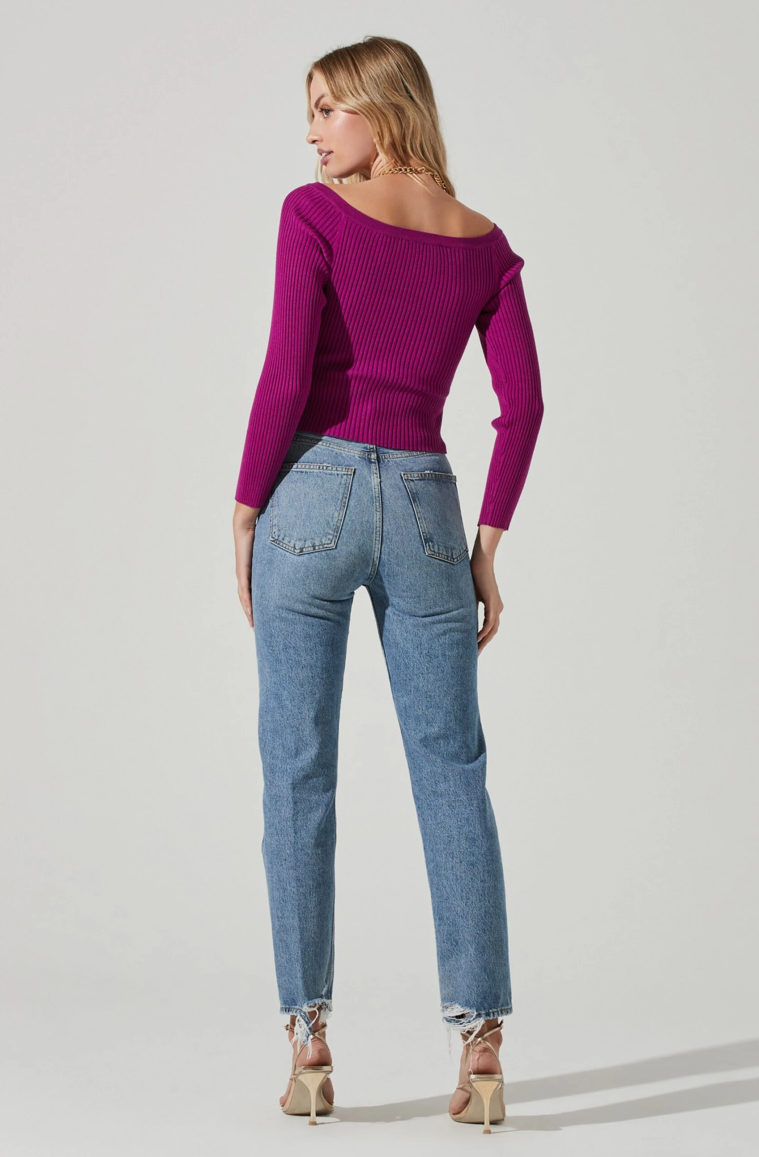 The Philippa Sweater features a ribbed knit construction. Boat neckline features a chunky gold chain accent and cutout accent. Long sleeves.