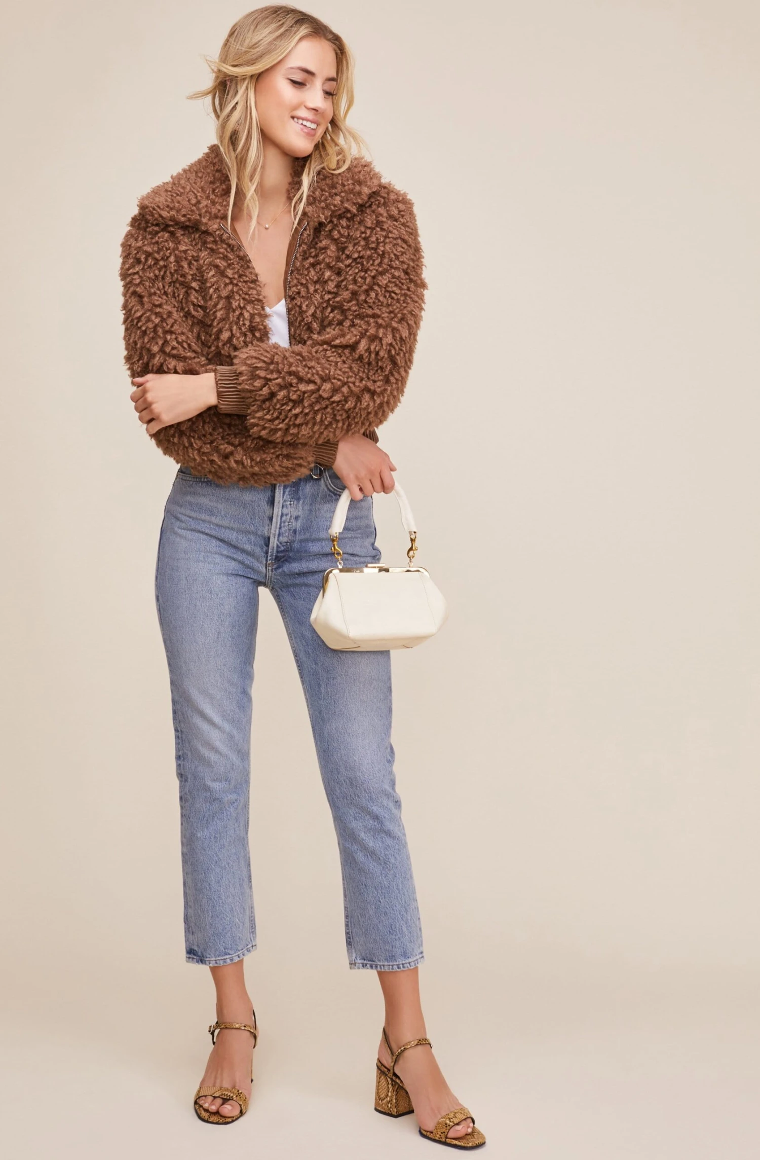 Warm up this winter with some faux fur. This ultra-flattering crop jacket features a pointed collar, front zip closure and long sleeves. Side flap pockets. Finished seams.