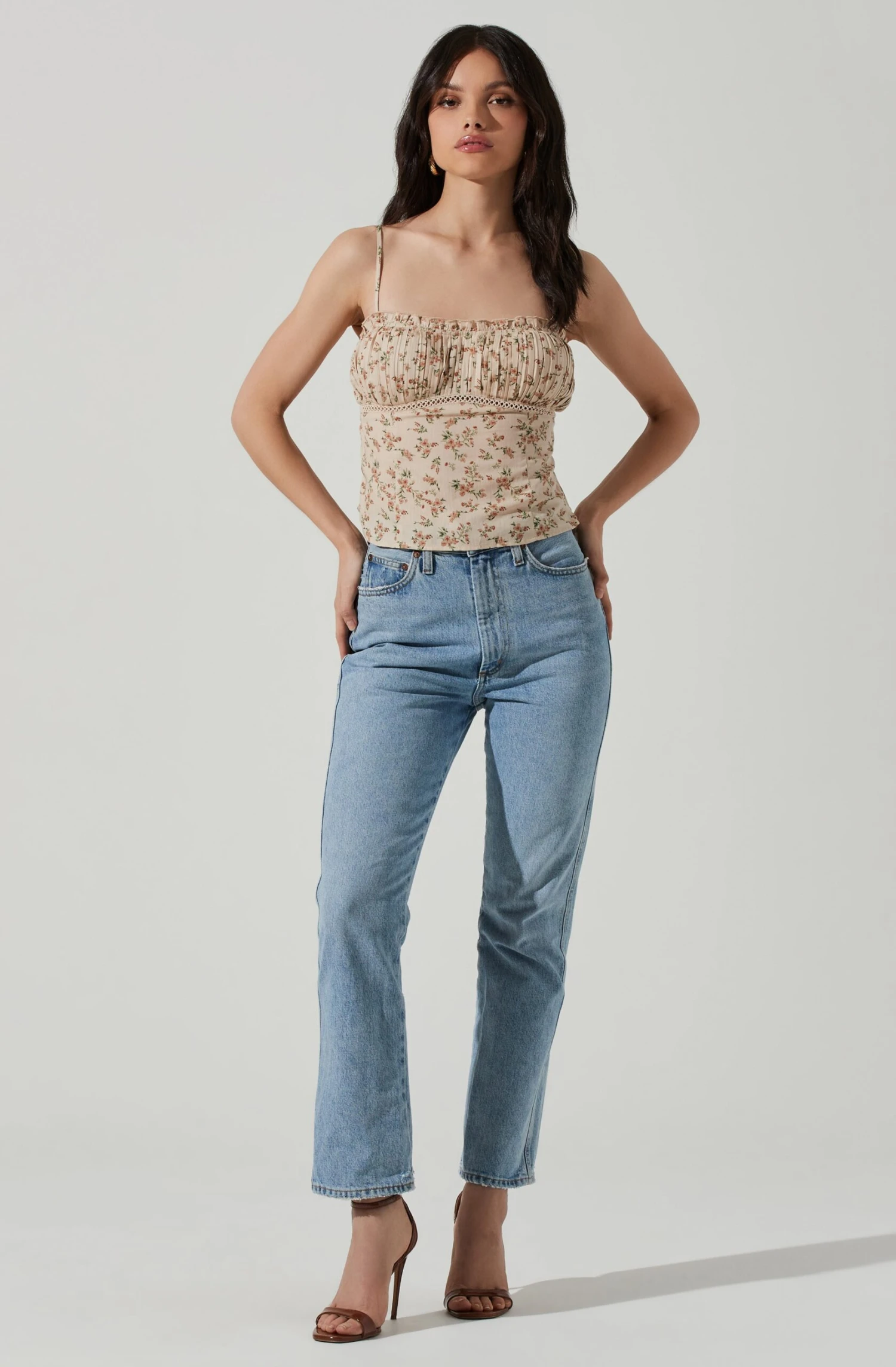 This cami features a romantic floral print throughout. Square neckline features a ruffle trim and underwired bust with pleat details. Adjustable straps. Darted bodice. Tie back accent. Concealed side zip closure.