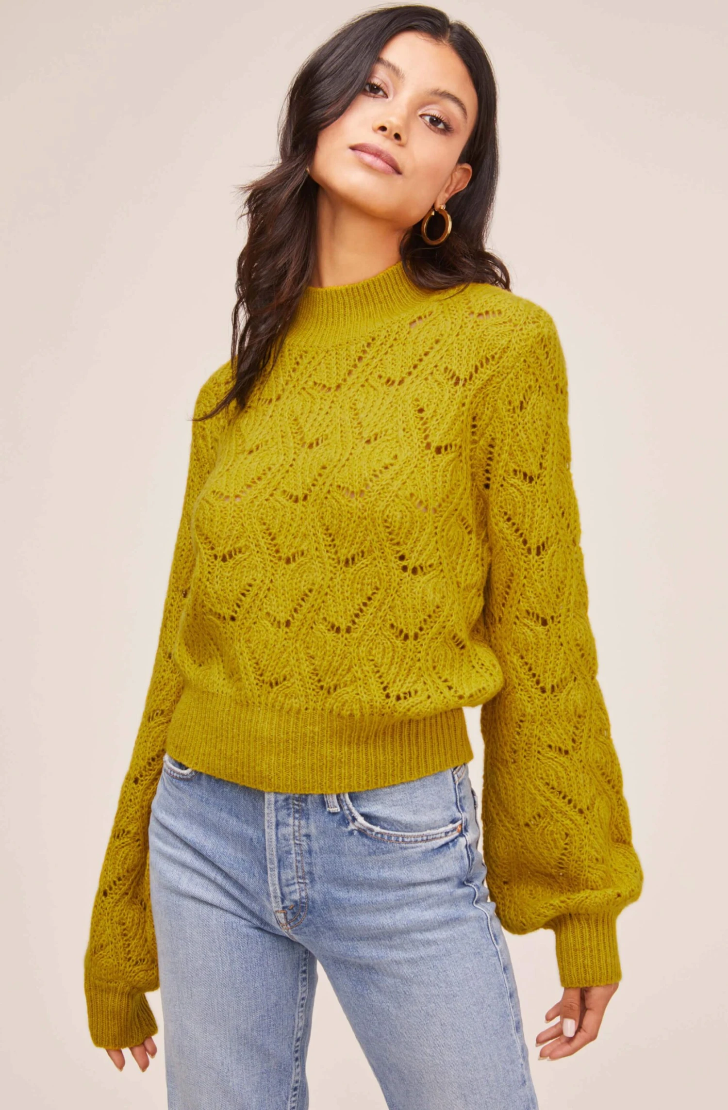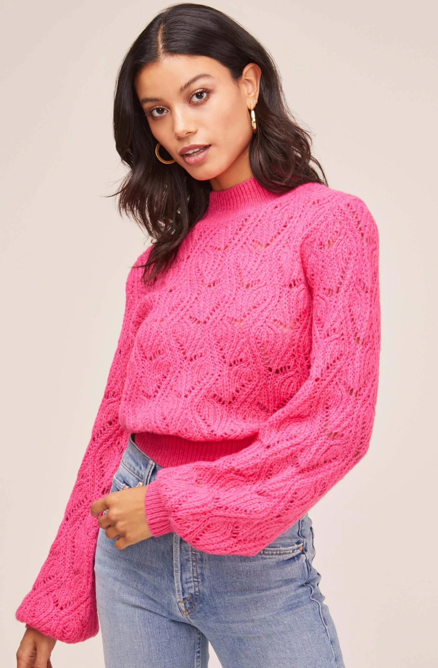 Don’t shy away from a little color! These bright and bold knit sweaters start with a mock neck collar, pointelle detailing throughout and long puff sleeves.