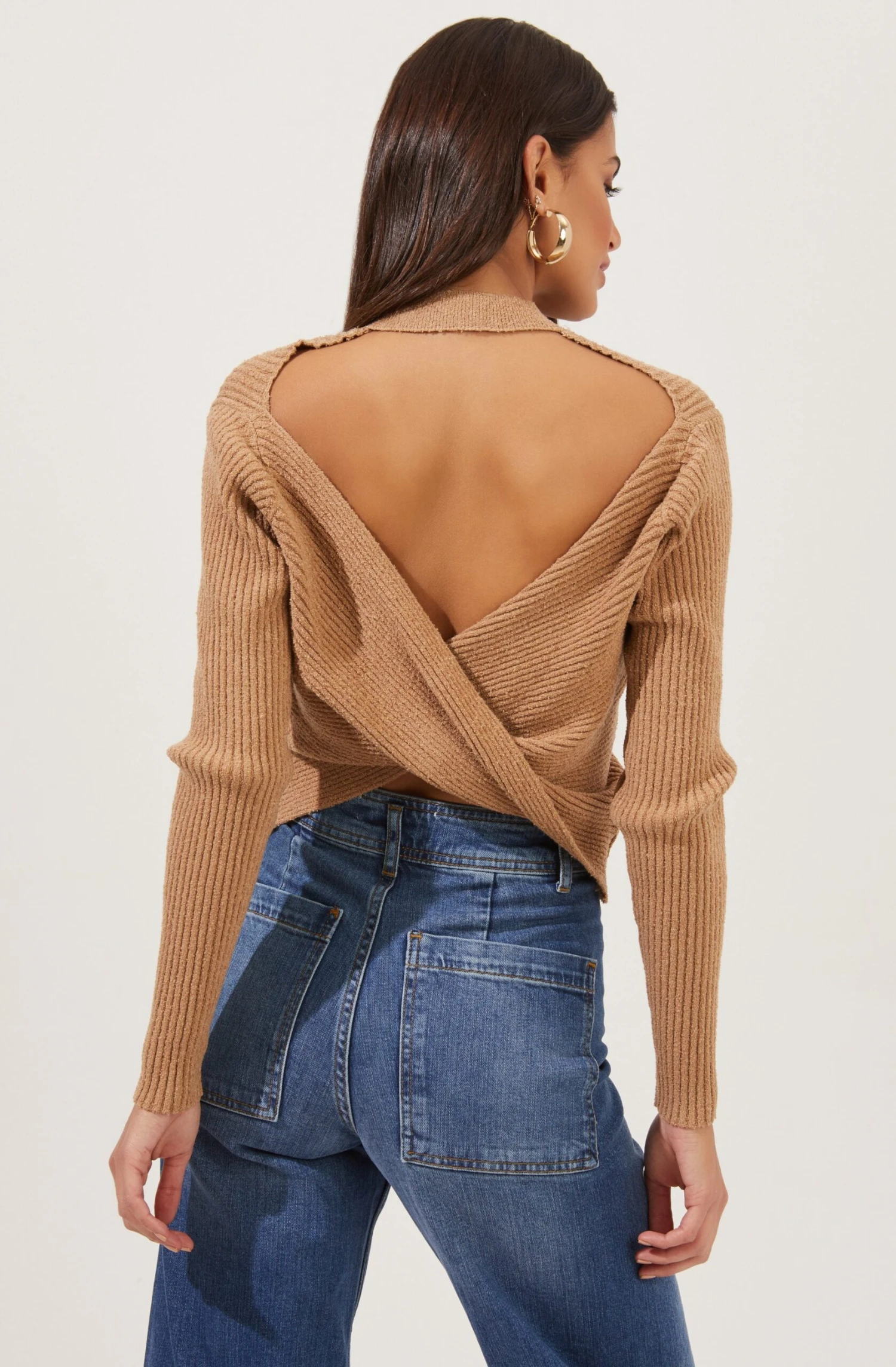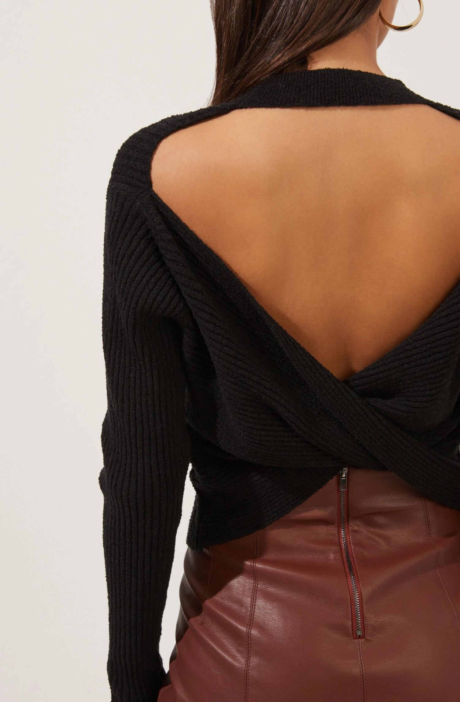 The Prescott Sweater features a classic round neckline that leads to a fitted silhouette. Ribbed knit construction adds texture. Cutout back with a twist hem detail at the waist. Long sleeves.