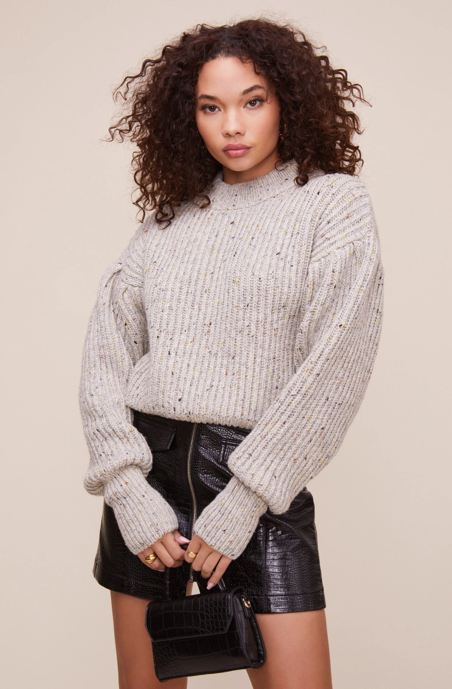Fall has arrived! The Regis sweater lets you enjoy the cold weather with a cozy mock neck that leads to a ribbed construction throughout. Long puff sleeves.