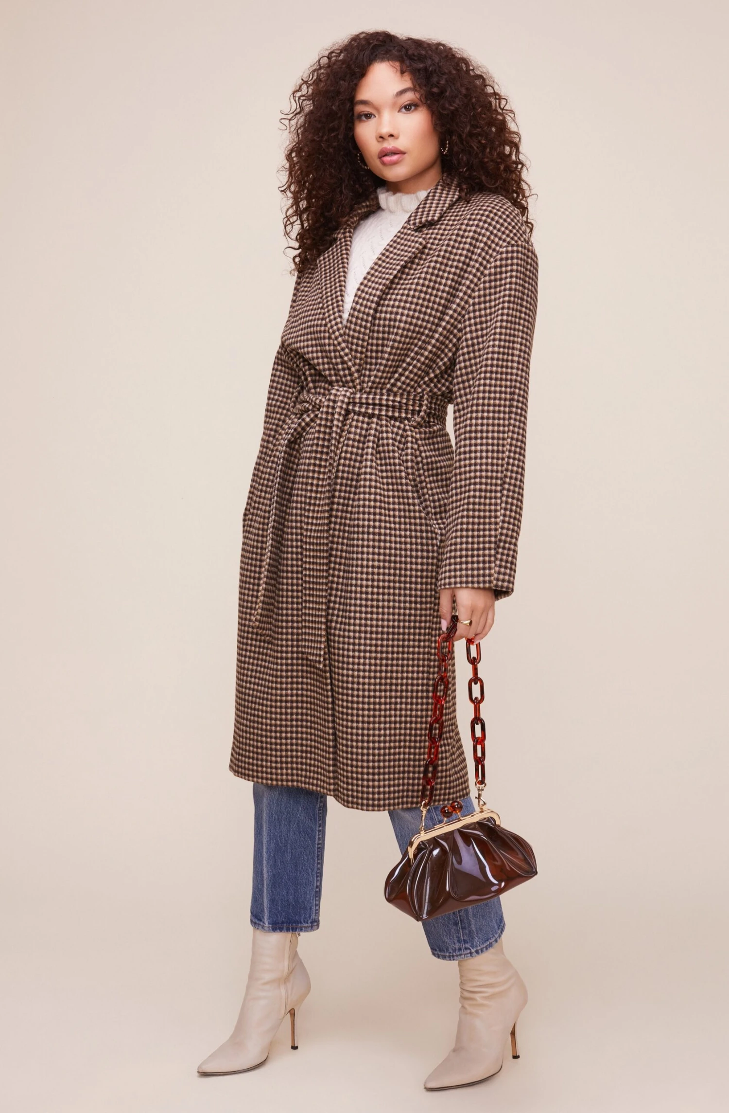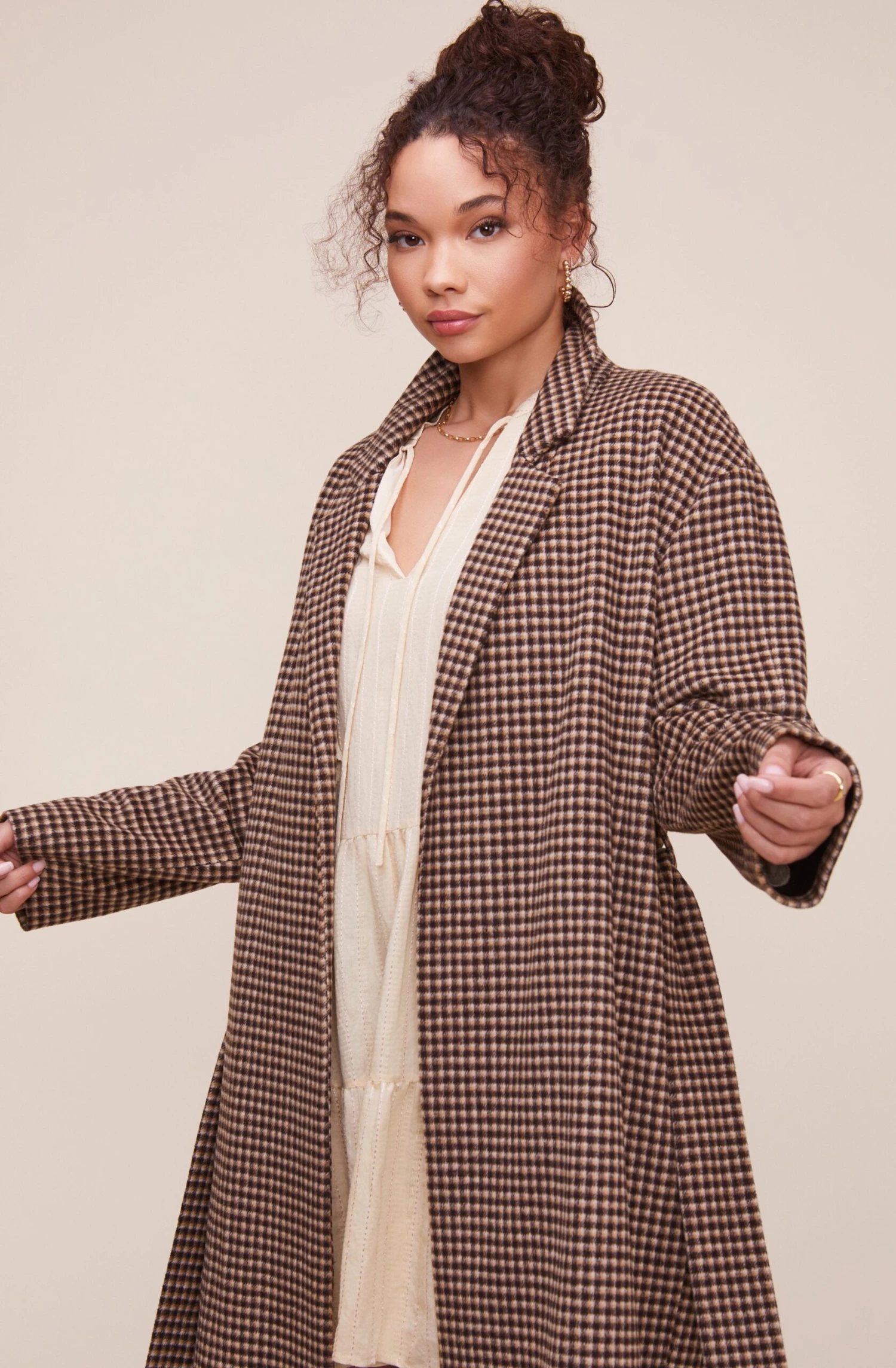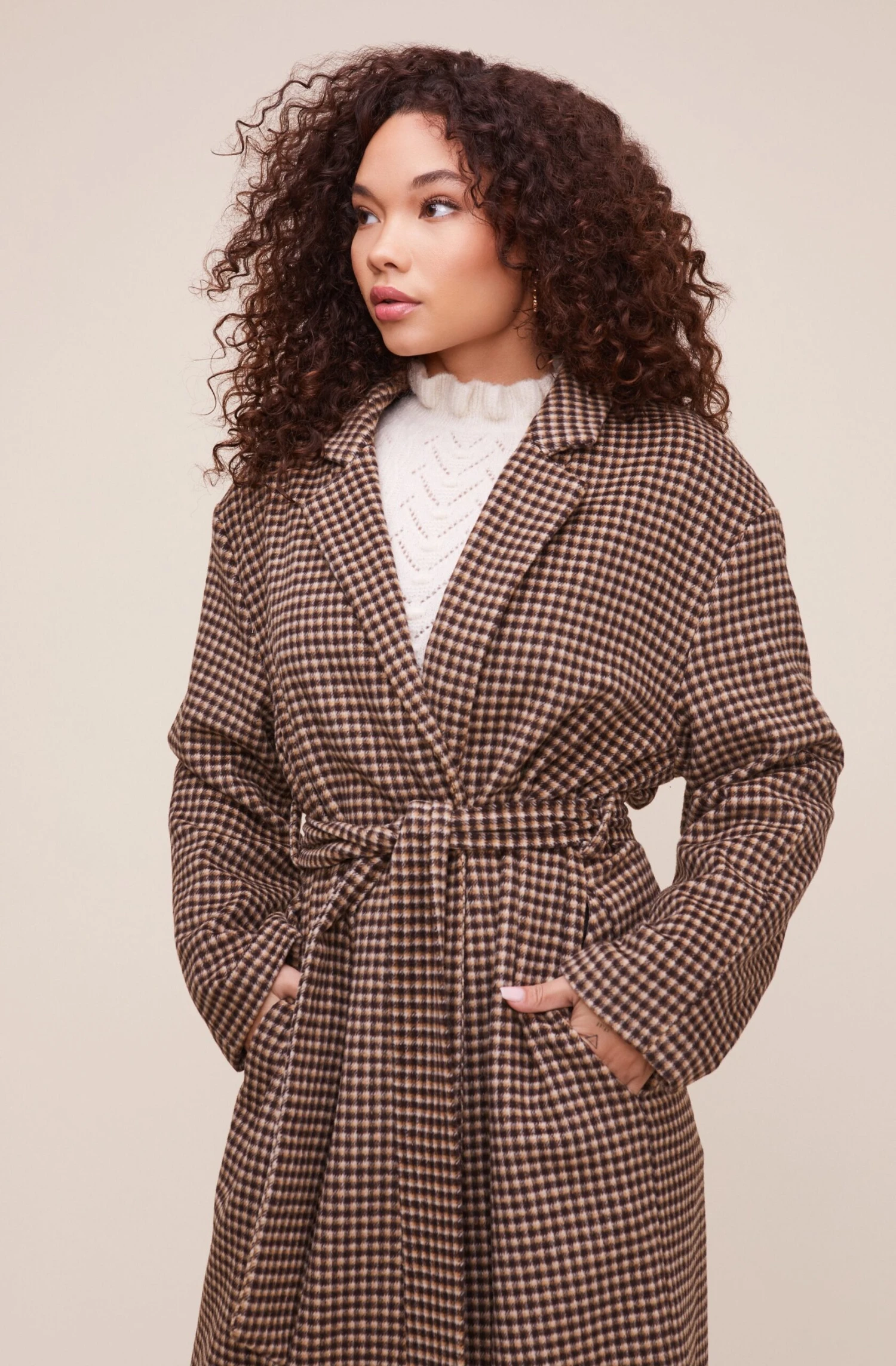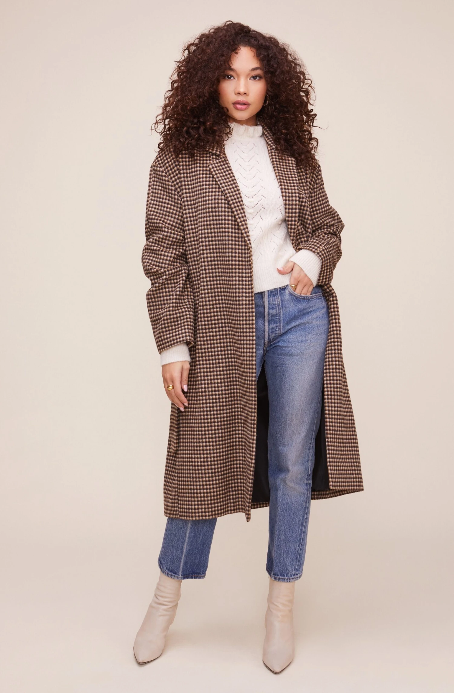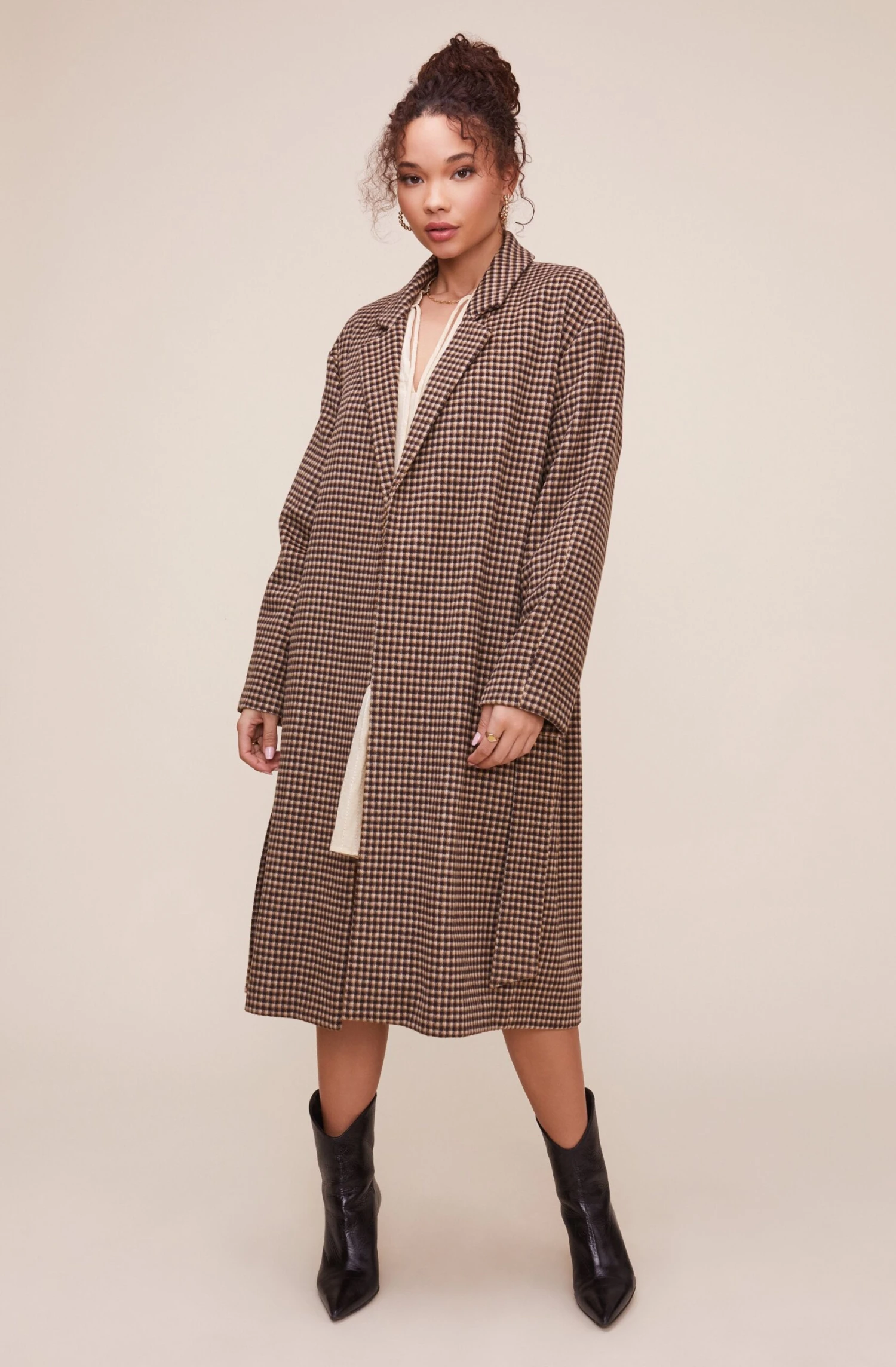 Your statement fall coat makes an appearance! The Roxanne coat features an oversized silhouette that starts with a notched collar that leads to an open front and slanted side pockets. Matching tie belt. Long sleeves.