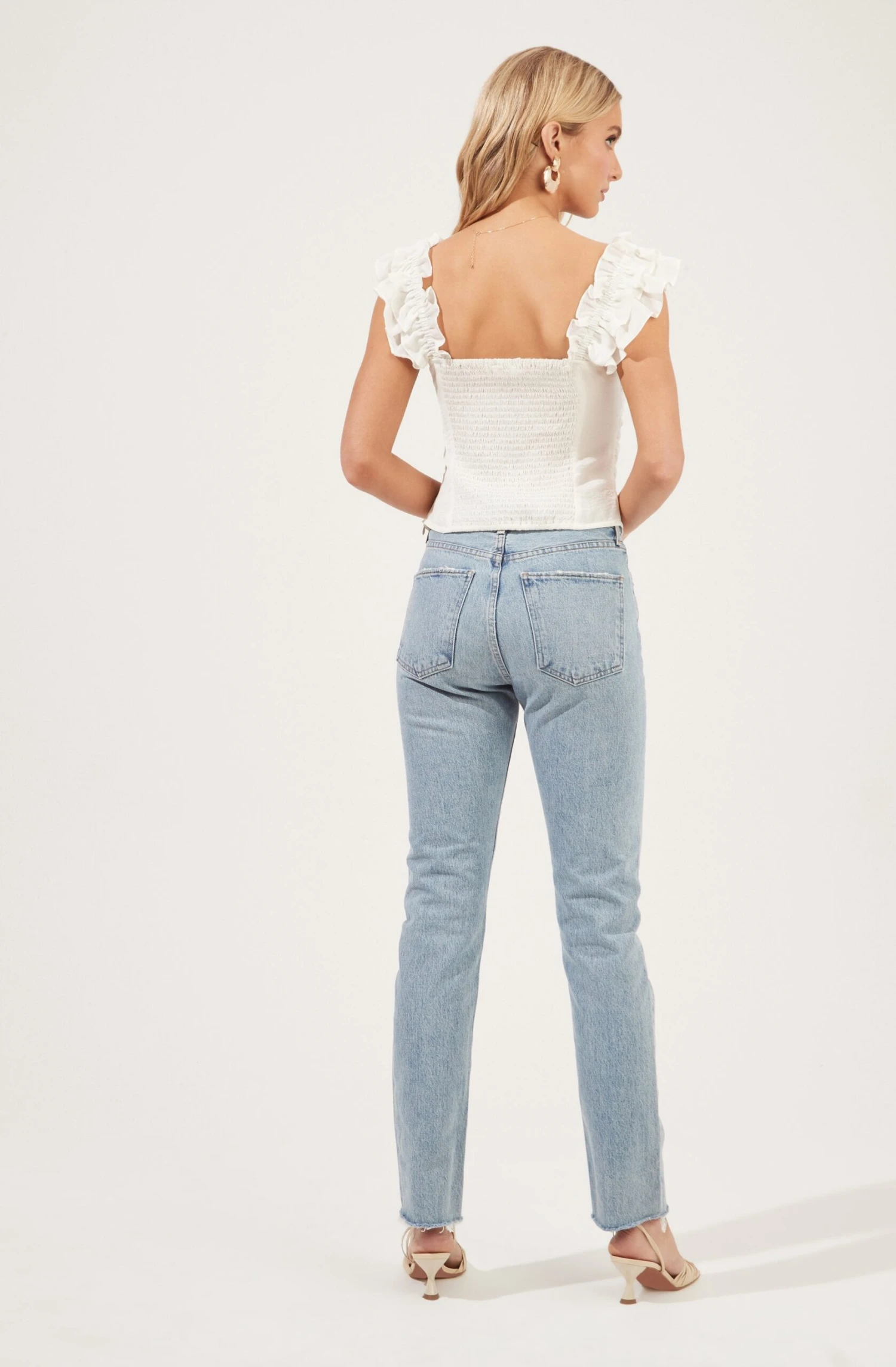 Statement tops make all the difference. This style features a V neckline that leads to a buttoned front and ruched design. Ruffle straps.