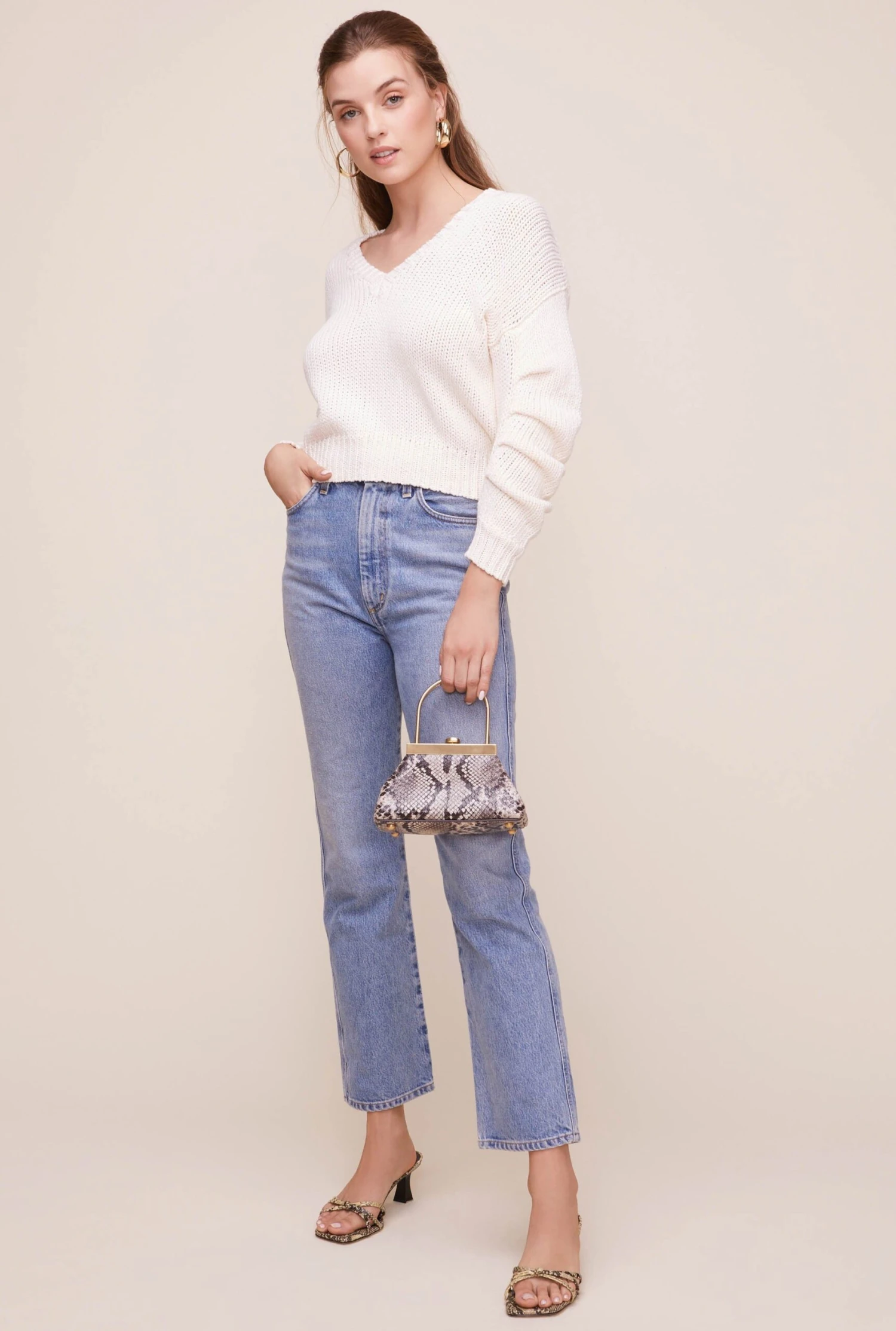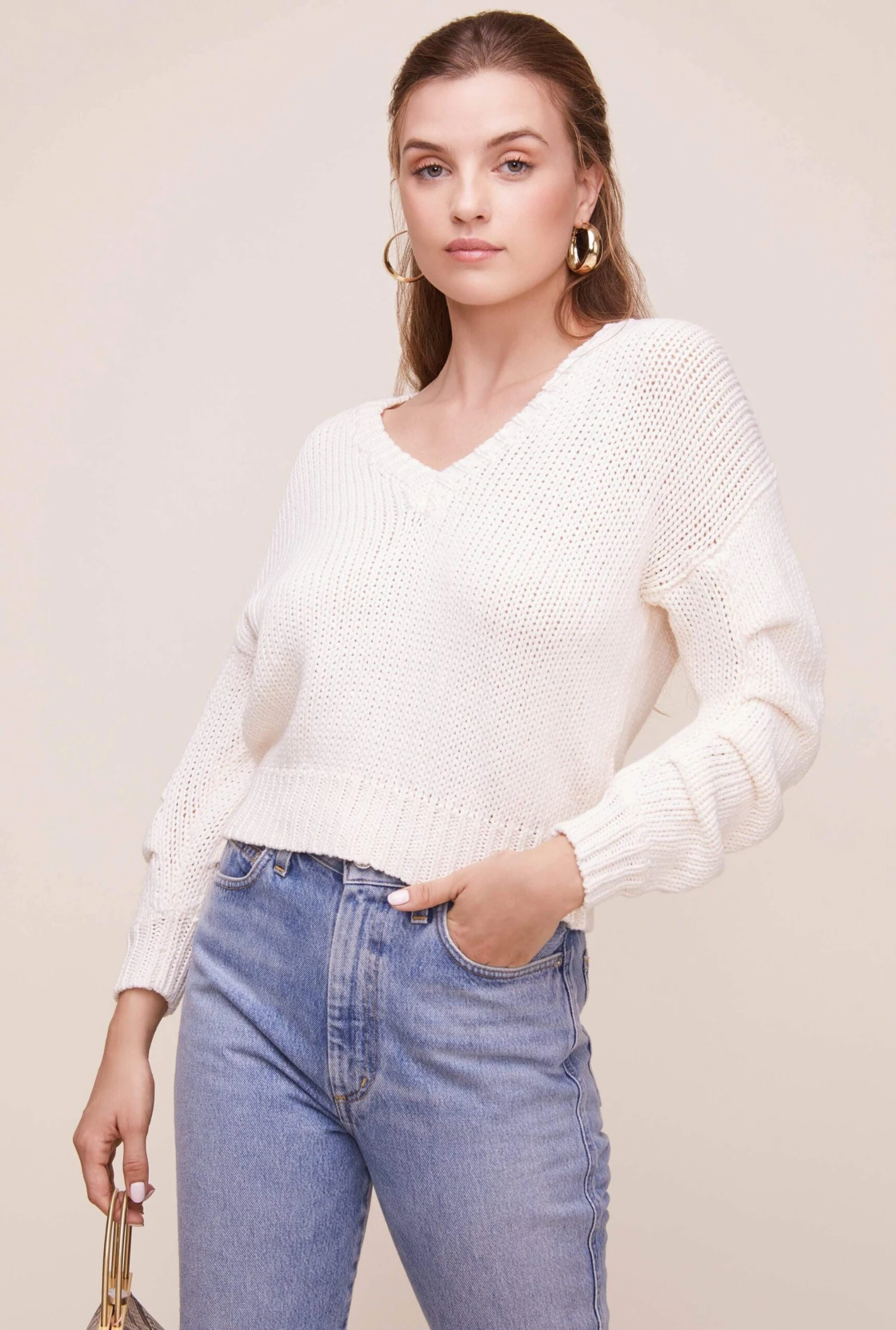 This wear-over-anything knit features a V-neckline, relaxed fit and ruched sleeves. Perfect for sweater days!