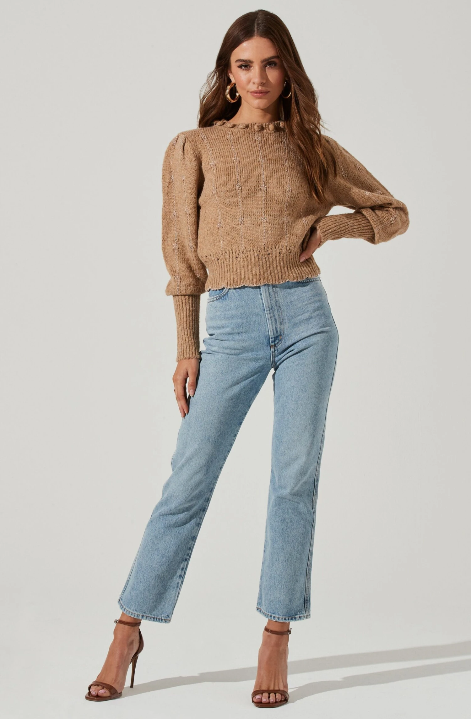 Cozy up in elevated knits! This sweater features a round collar with pom pom accents. Stripe pattern features metallic thread accents. Long sleeves with puff shoulders. Scalloped hem.