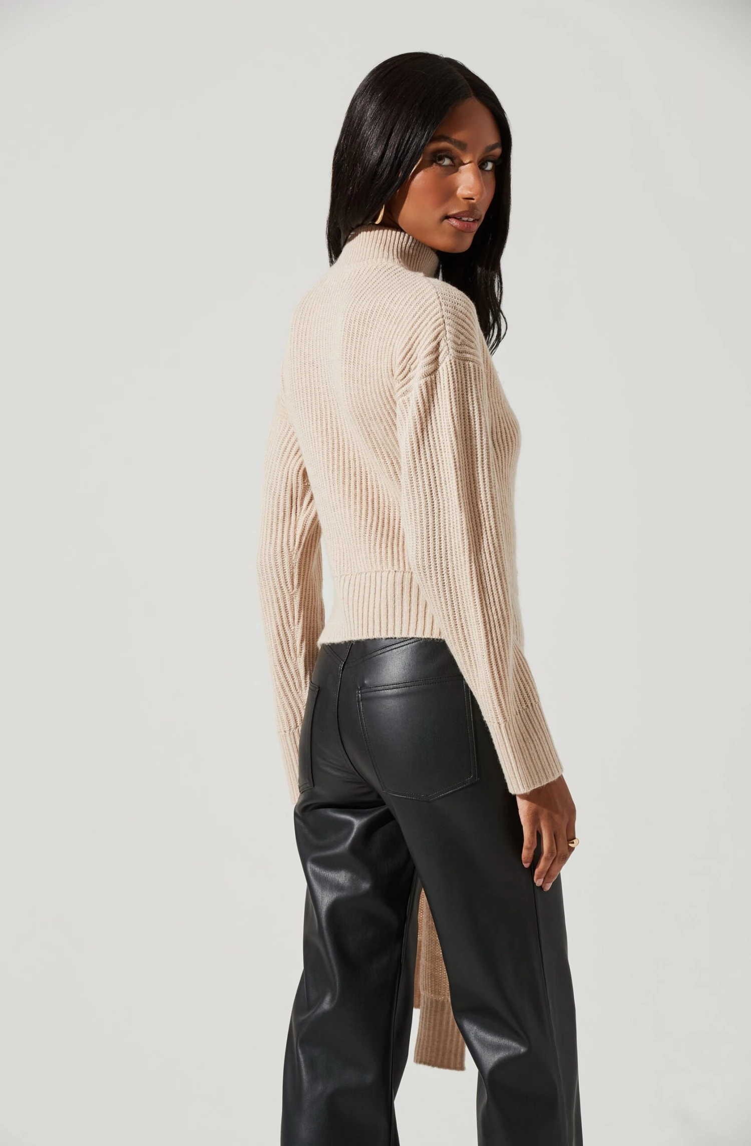 The Sora Sweater features a ribbed knit construction. Mock neck leads to a cutout shoulder detail. Wrapped front leads to a tie waist. Long sleeves.