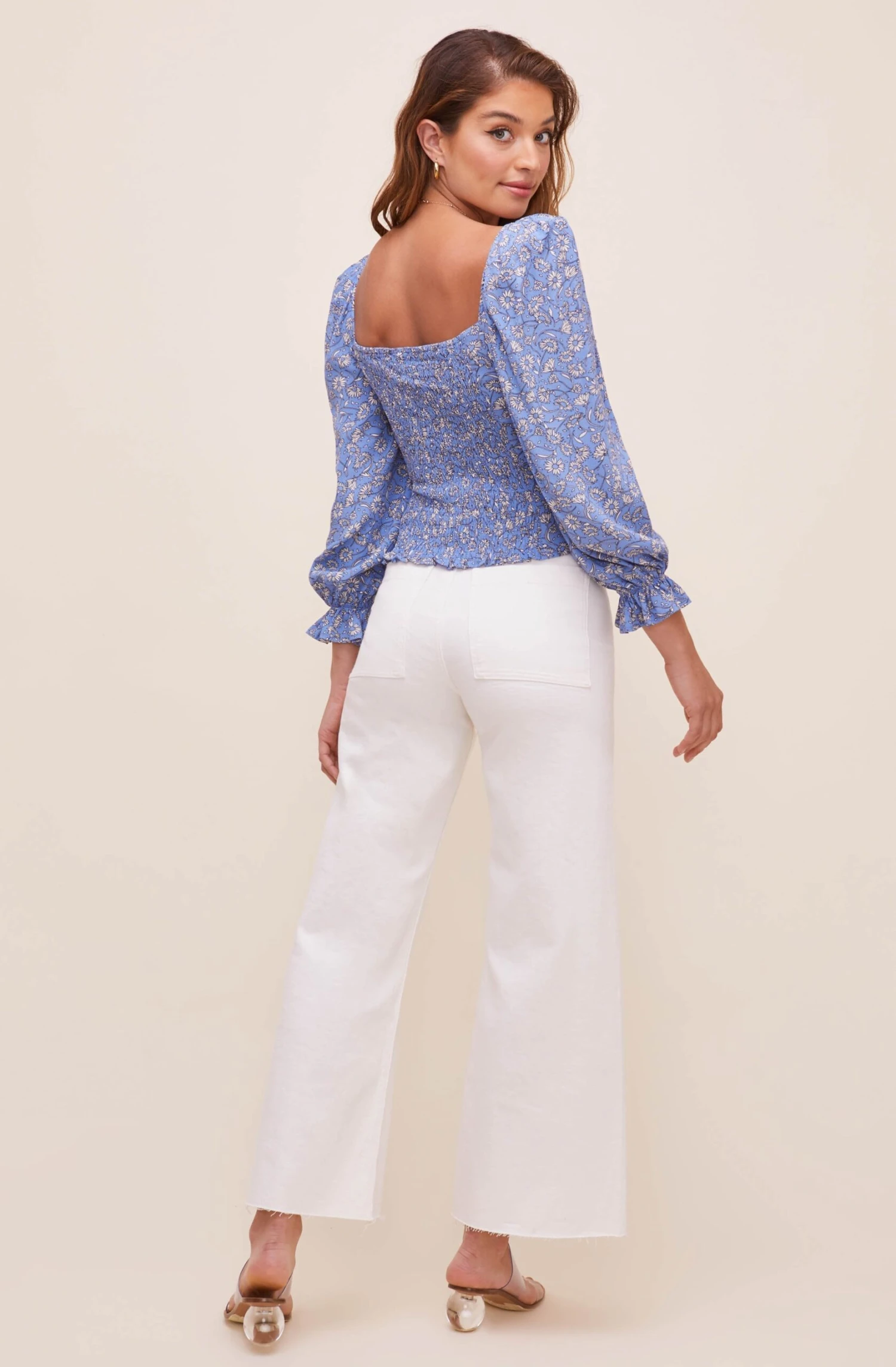 Lovely spring looks are in bloom. The Tonina Top features a square neckline that leads to a shirred front. Long puff sleeves with ruffle cuffs. Floral print throughout.