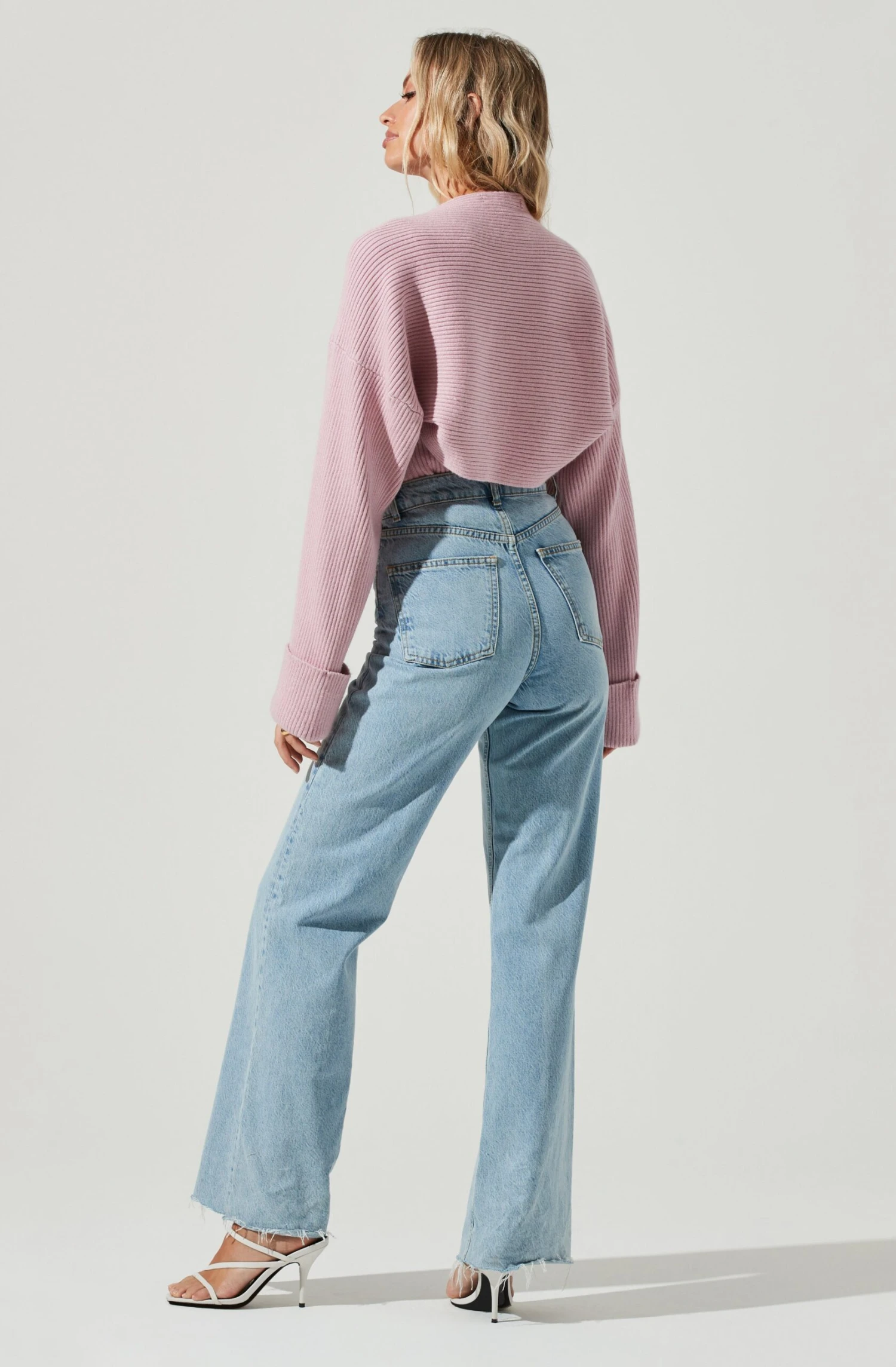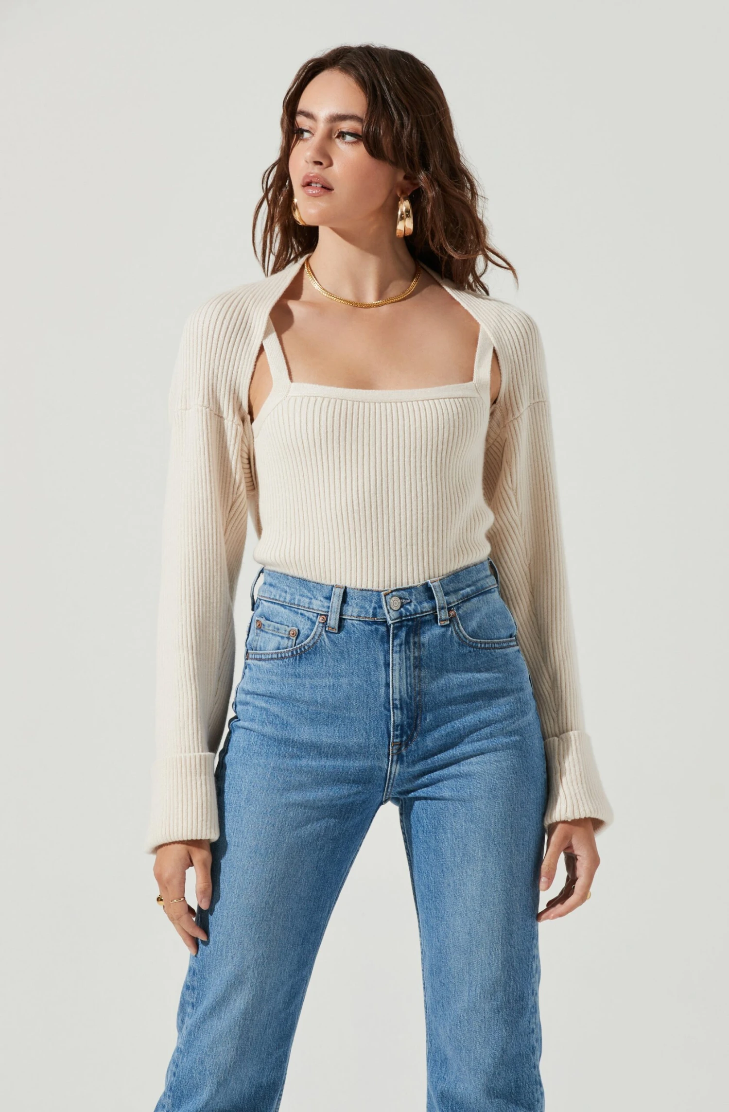 This sweater set features a cropped shrug sweater that matches a square neck cami tank top. Slight stretch. Long sleeves.