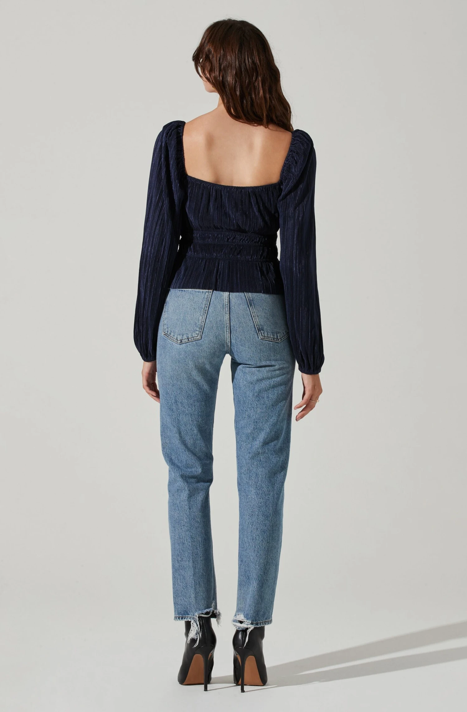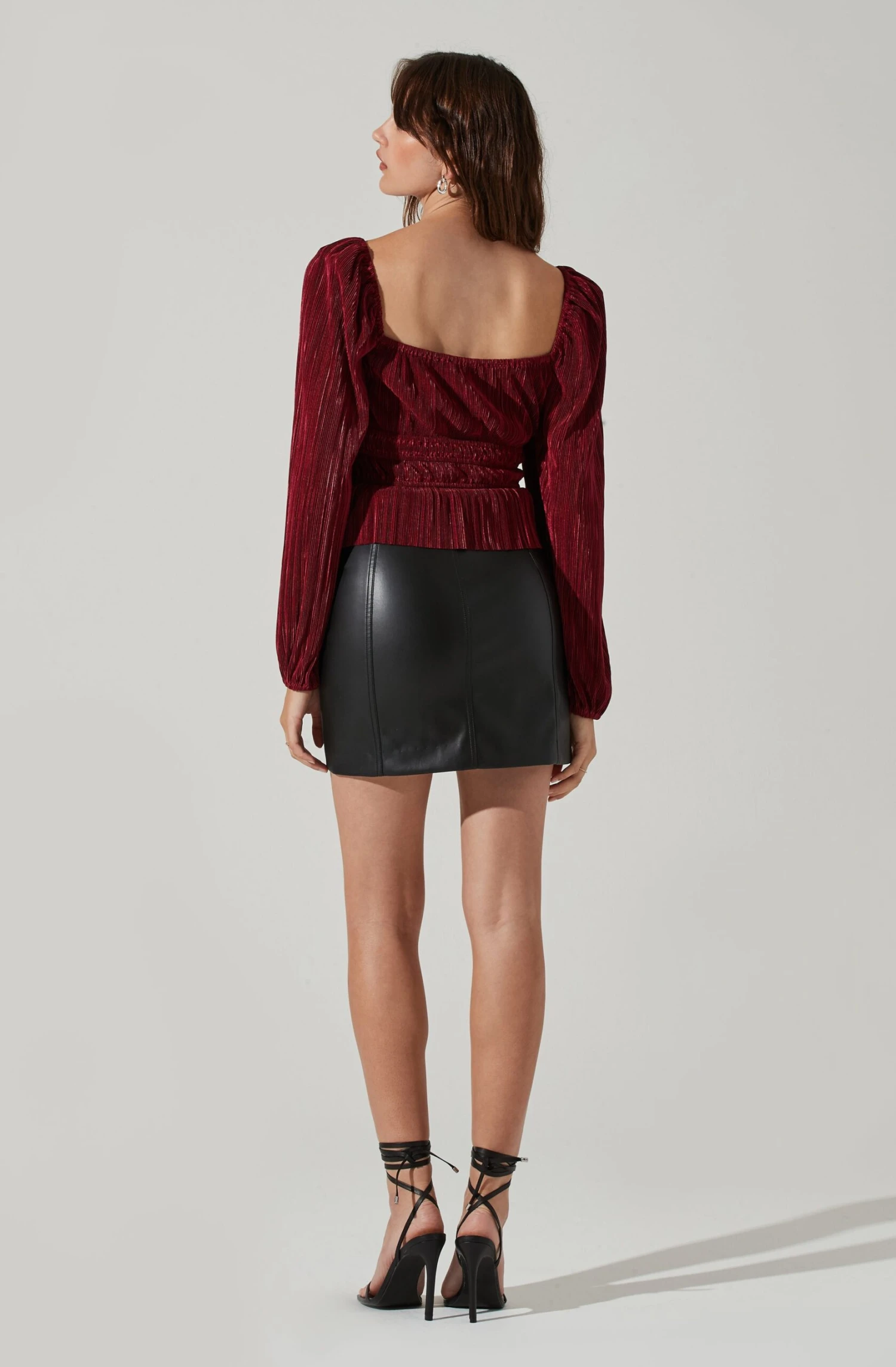 The Ziva Top features a chic plisse design throughout. Square neckline leads to a darted bodice that accentuates. Long balloon sleeves. Peplum hem.